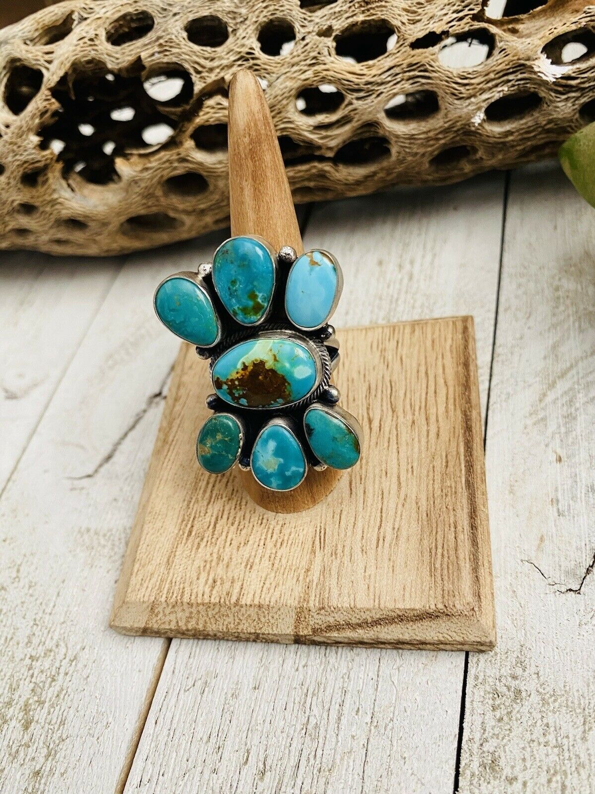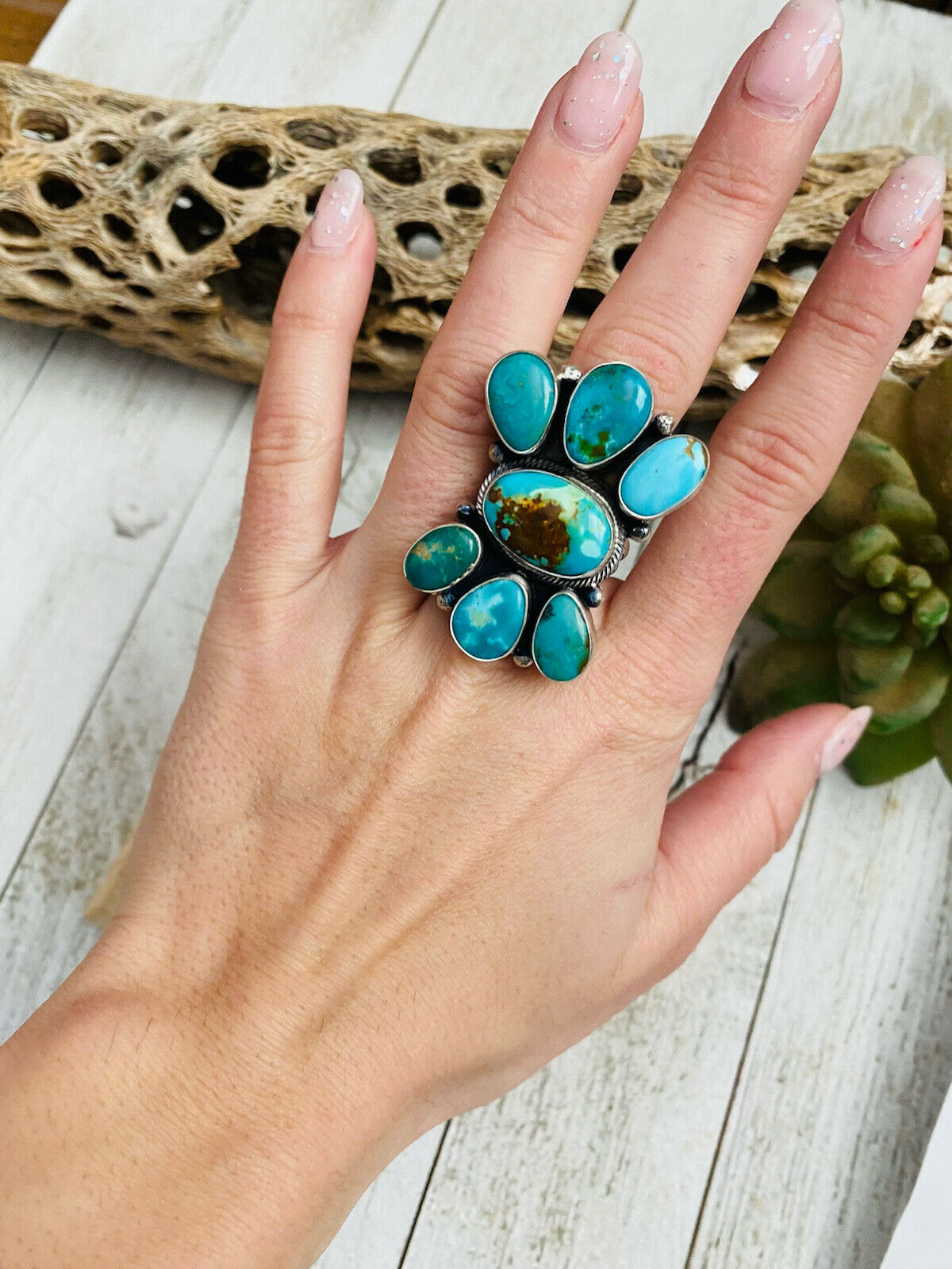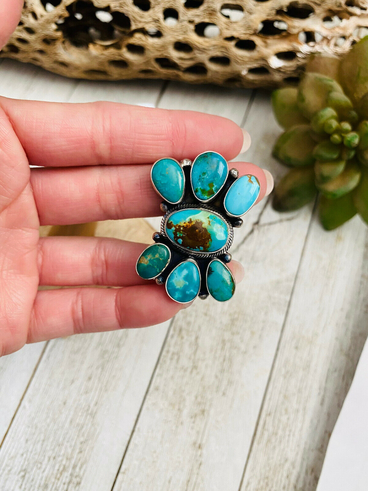 Stunning Handmade Sterling Silver and Royston Turquoise Cluster ring. Classic elegant style of the Southwest. Size 7.5. Measuring 1 3/4 inches long and 1 1/4 inches wide. Signed by the artist and stamped Sterling. Really amazing ring!