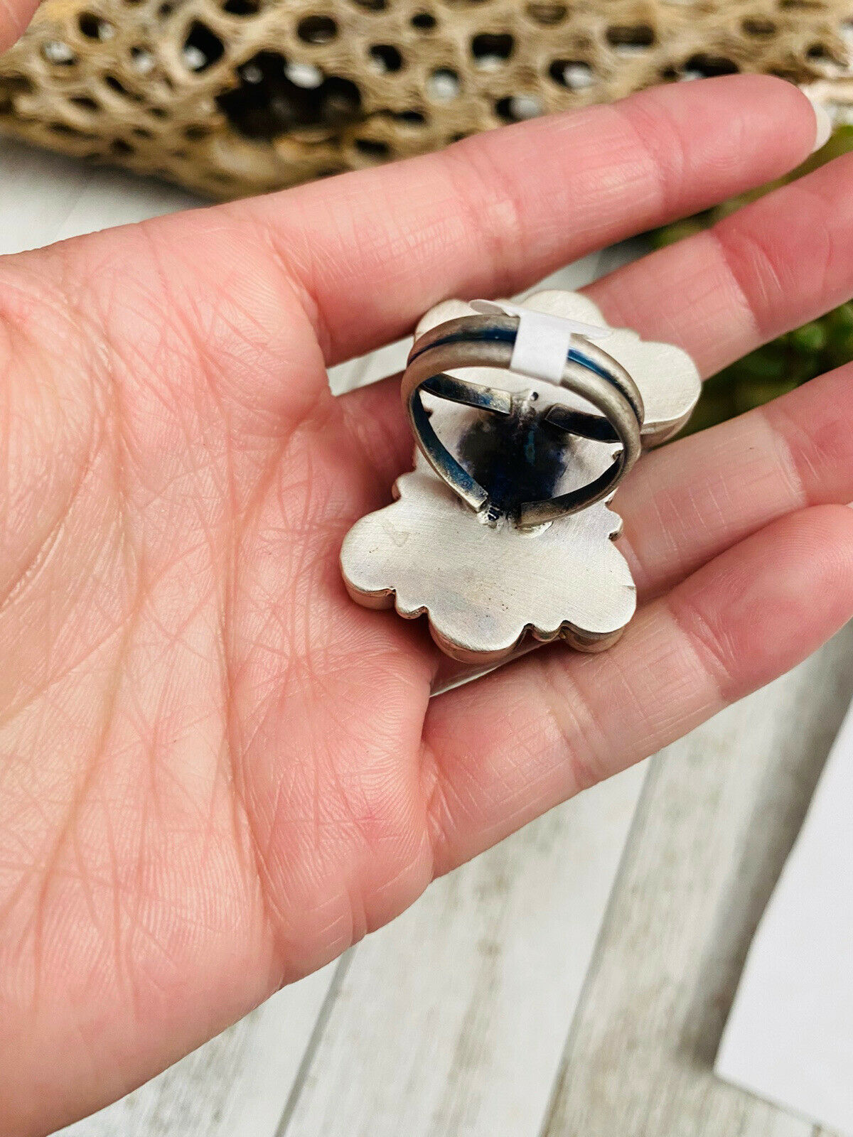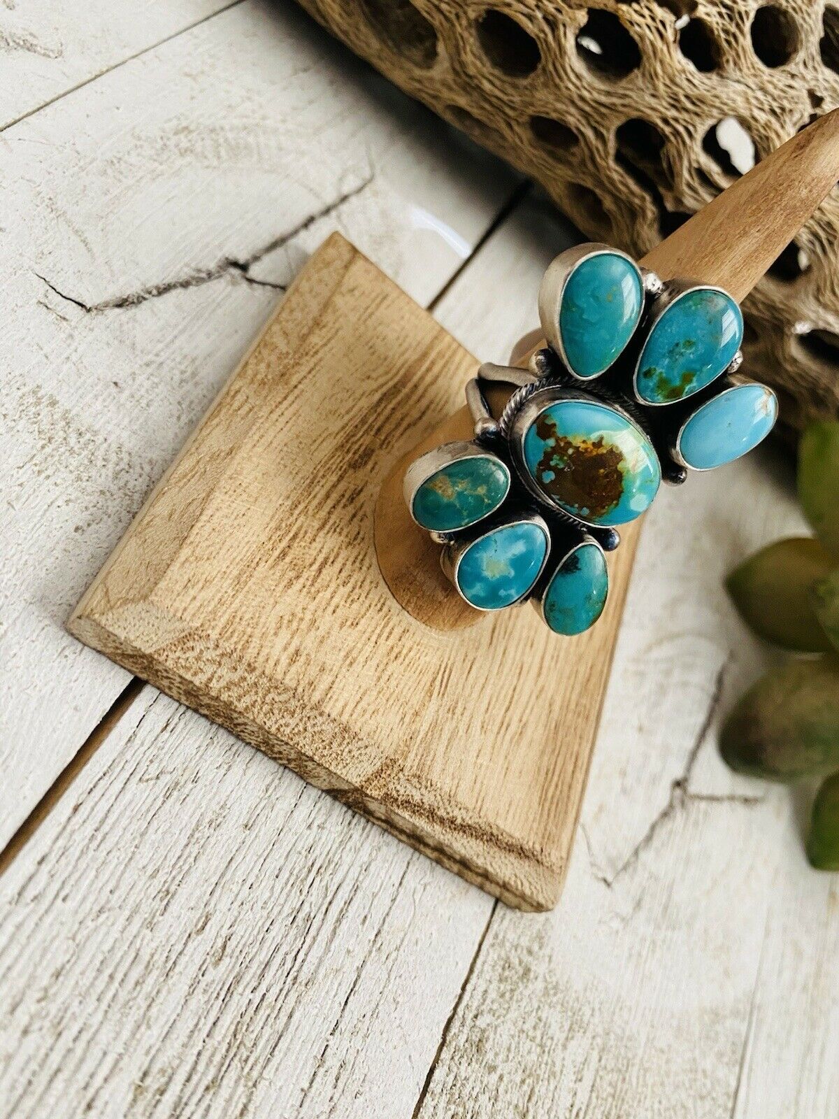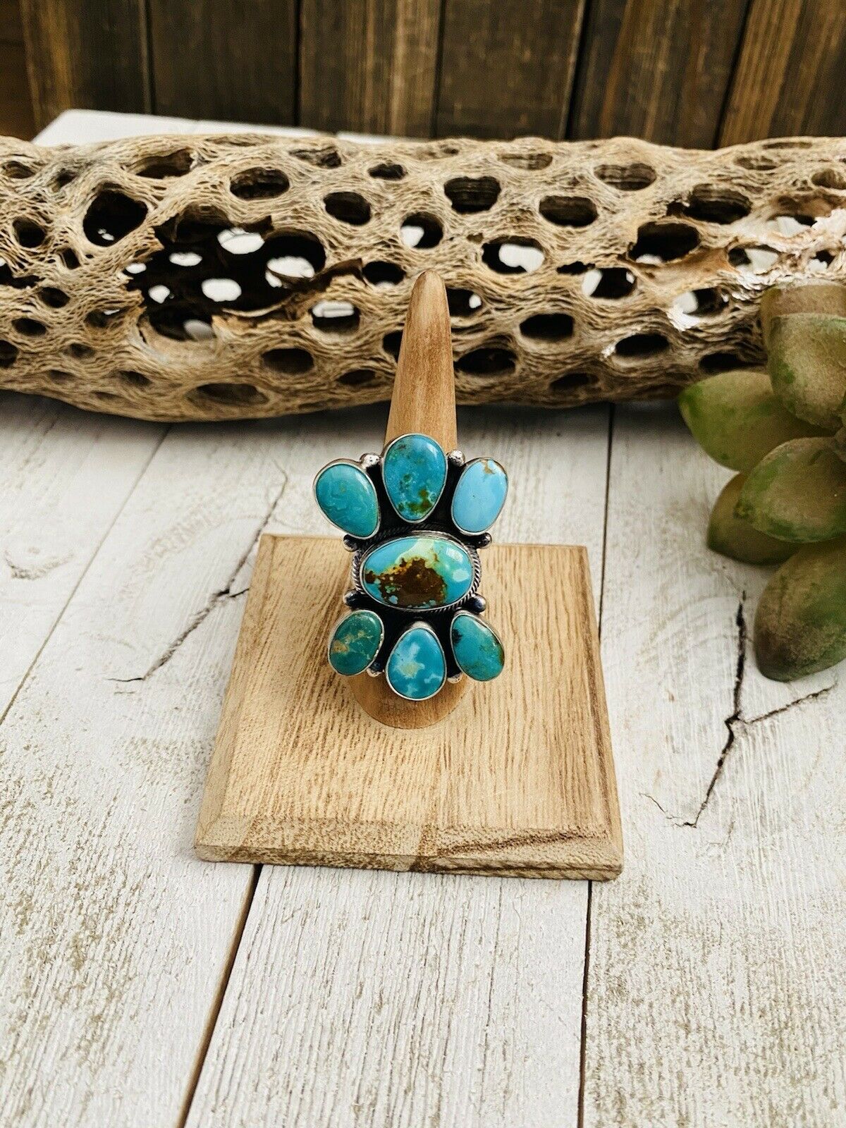 Stunning Handmade Sterling Silver and Royston Turquoise Cluster ring. Classic elegant style of the Southwest. Size 7.5. Measuring 1 3/4 inches long and 1 1/4 inches wide. Signed by the artist and stamped Sterling. Really amazing ring!