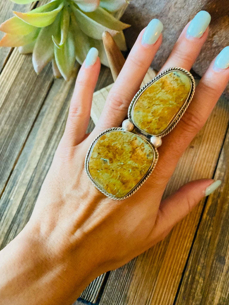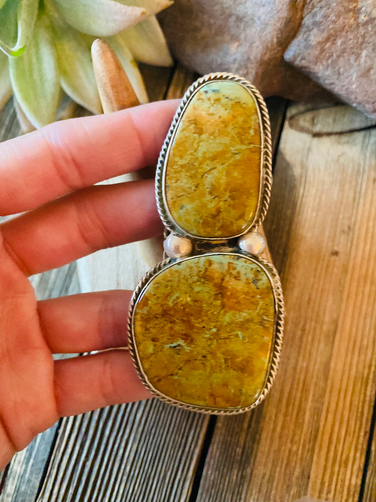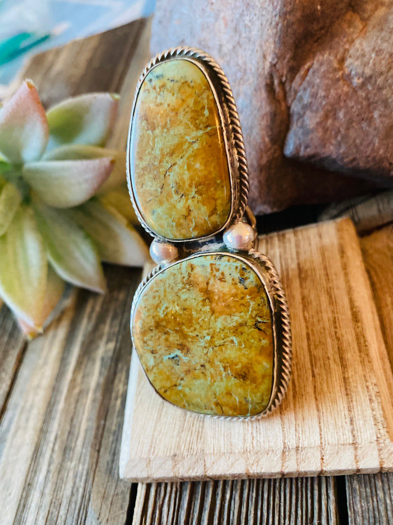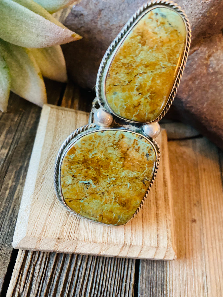 Beautiful Navajo Sterling Silver and Royston Turquoise ring. Size 9. Measuring 3 3/8 inches long and 1 1/2 inches wide. Such gorgeous stones in this ring! Signed by the artist and stamped Sterling.