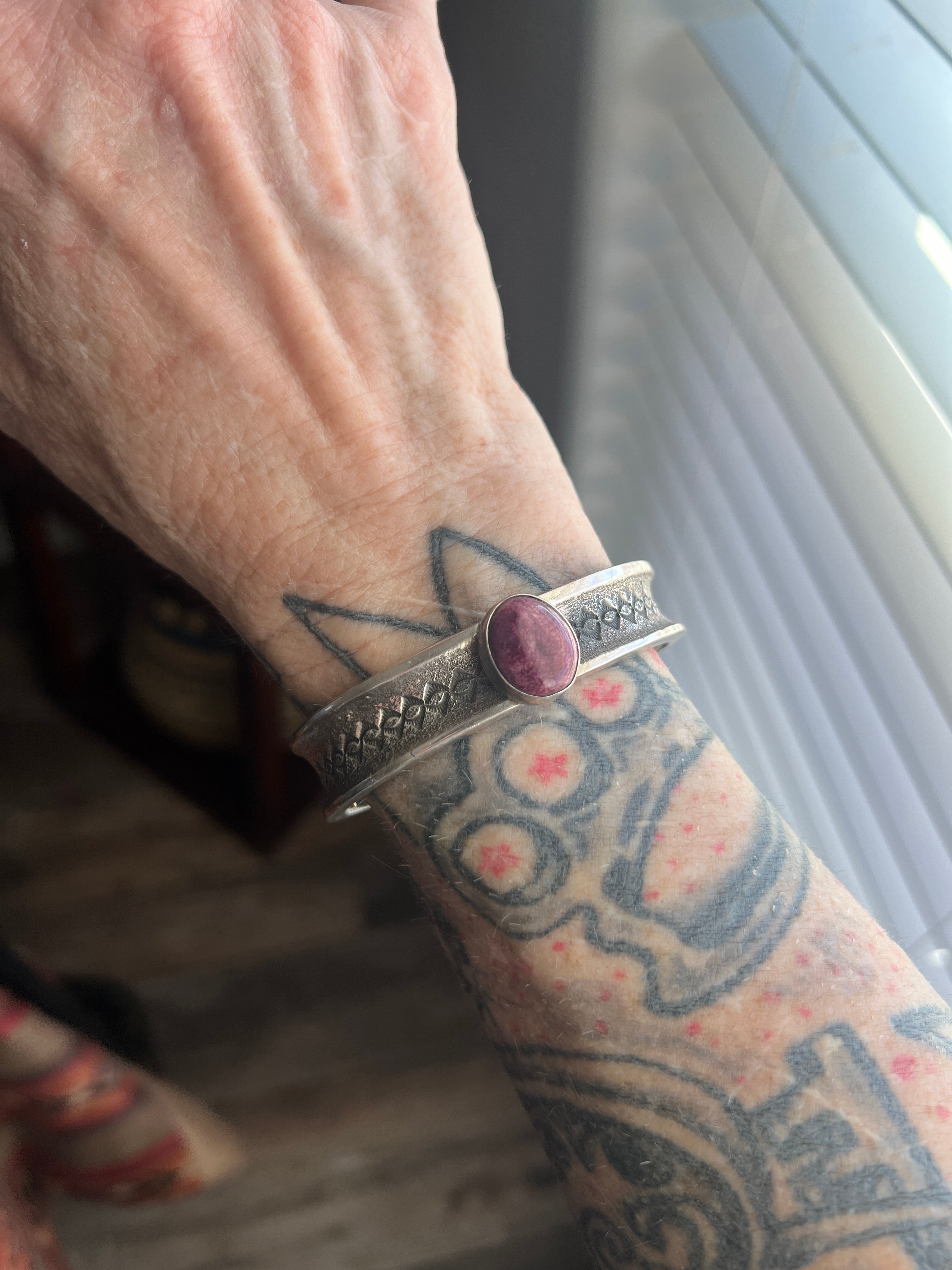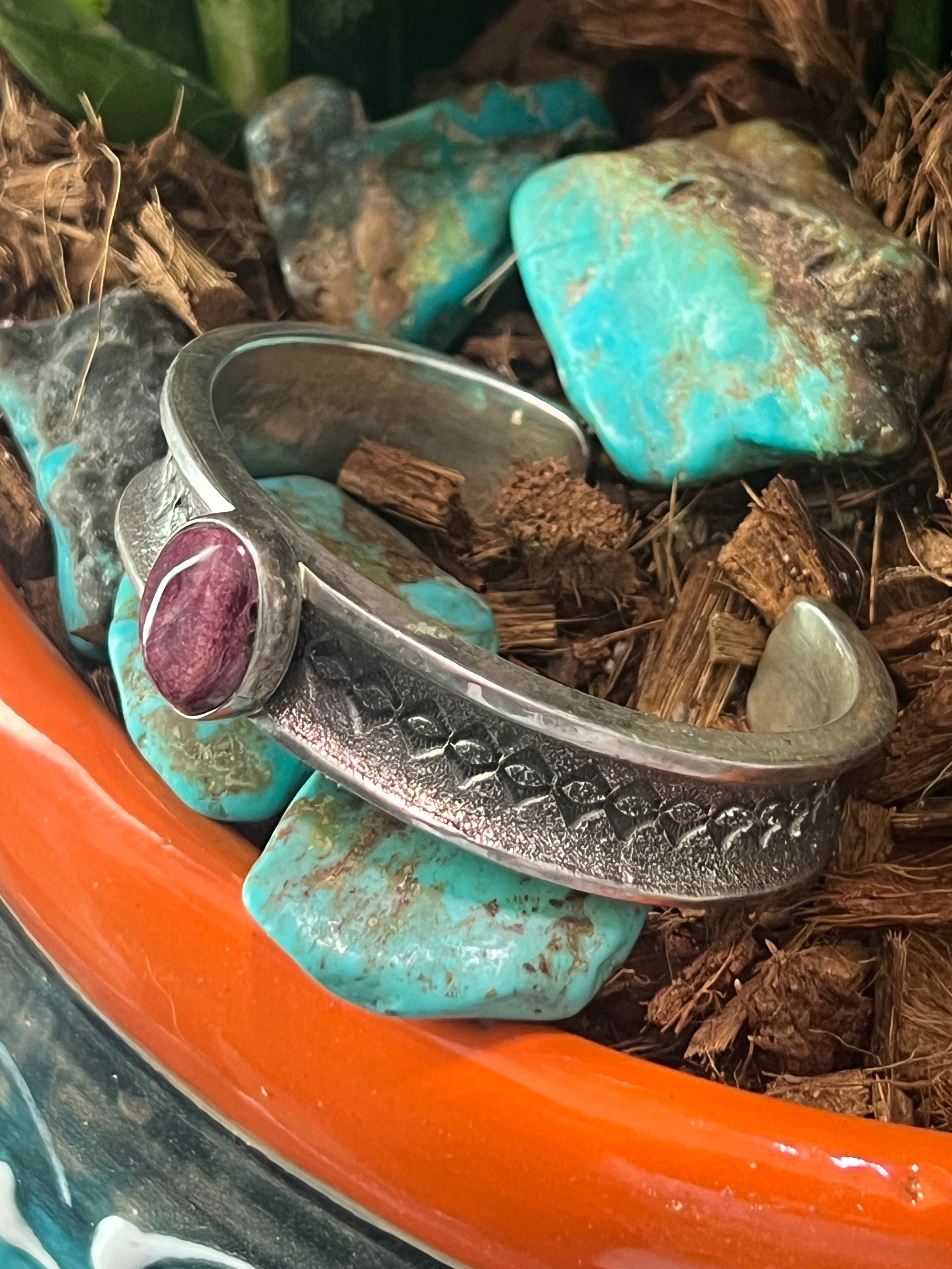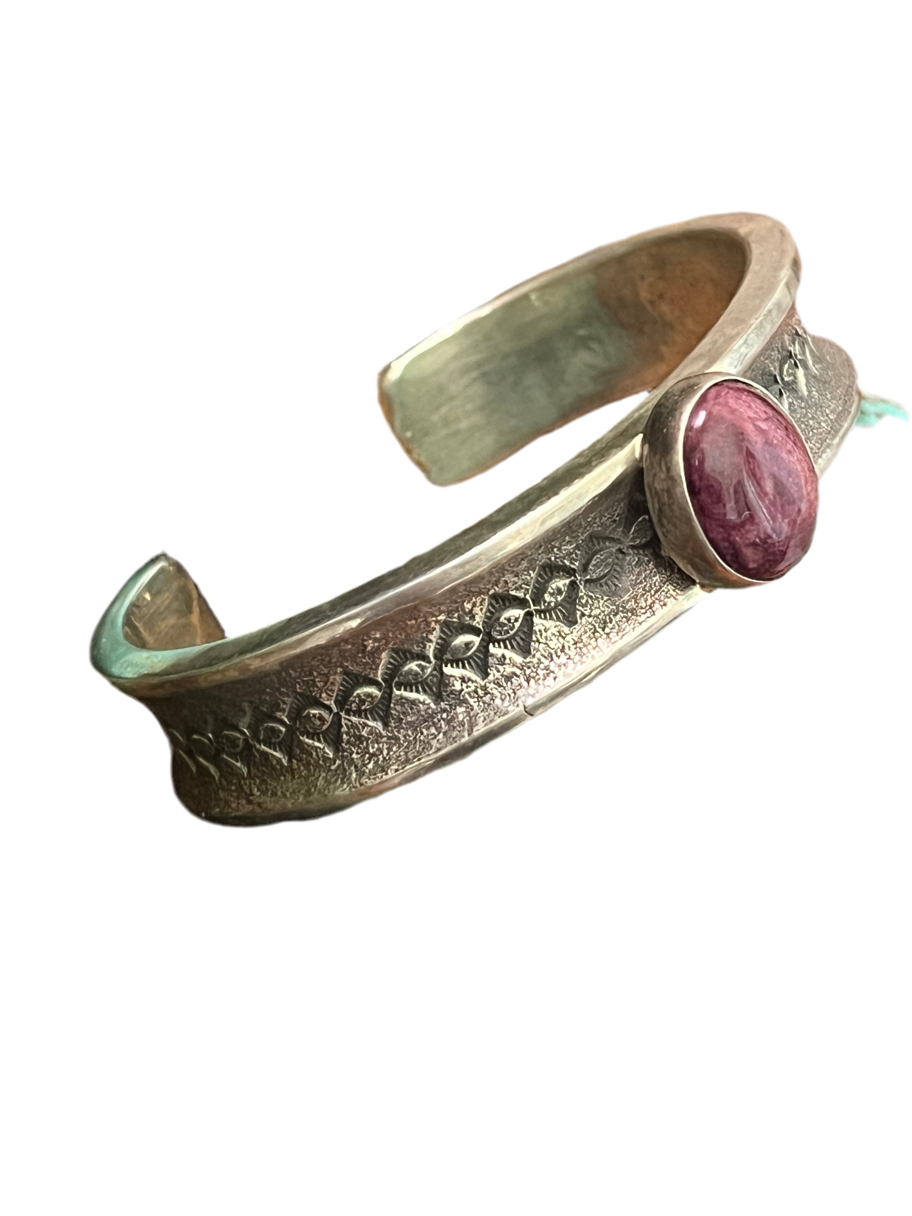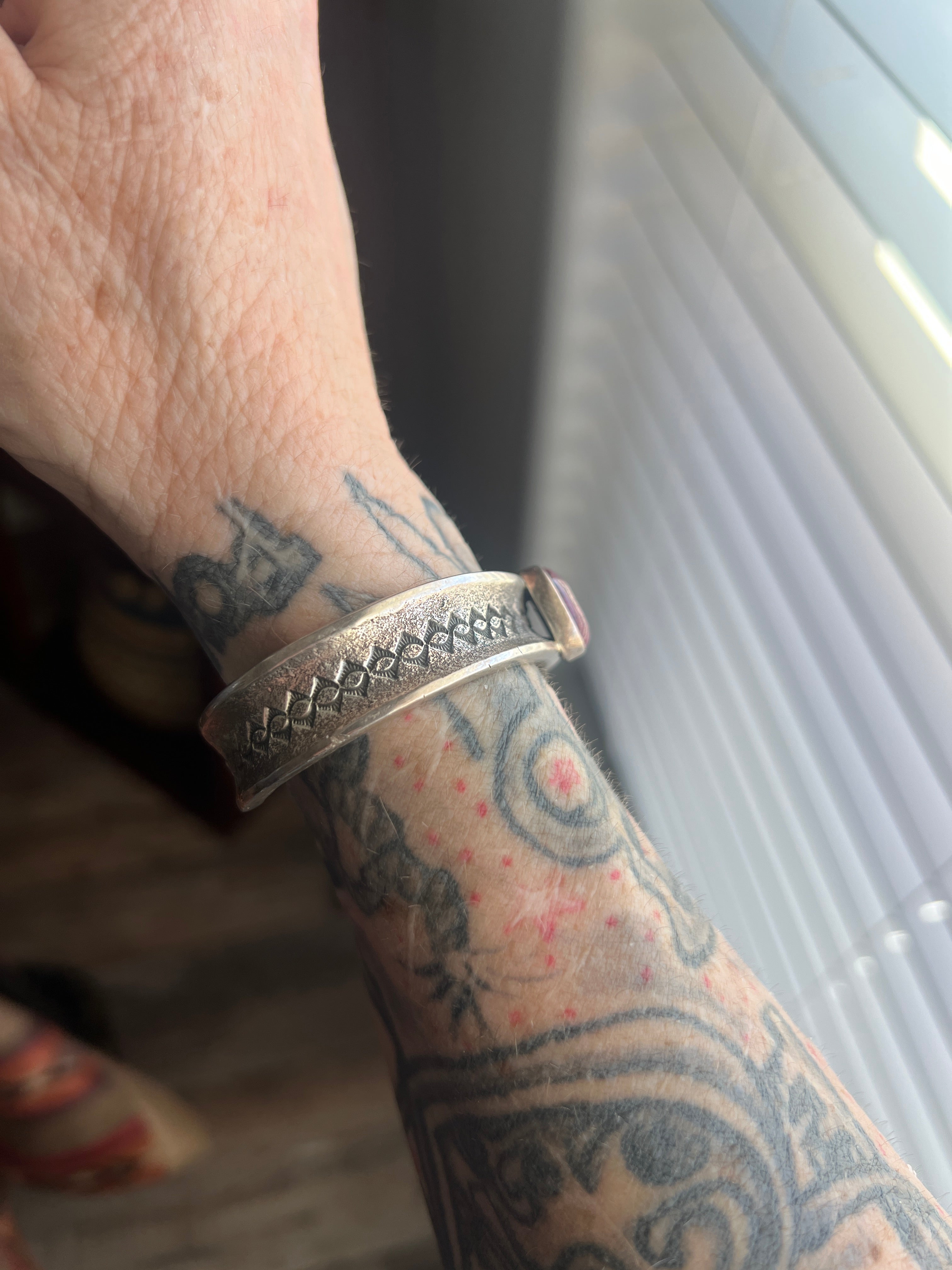 This gorgeous tufa cast sterling cuff made by silversmith, Gary Custer, features expert stamp work and a single piece of purple spiny oyster shell. It is just over 1/2” wide and measures 5-1/2 inches around the inside plus a 1 inch gap. It is seen in the photos fitting loosely on a 6-1/4 inch wrist (without falling off), which is the perfect opportunity for stacking.