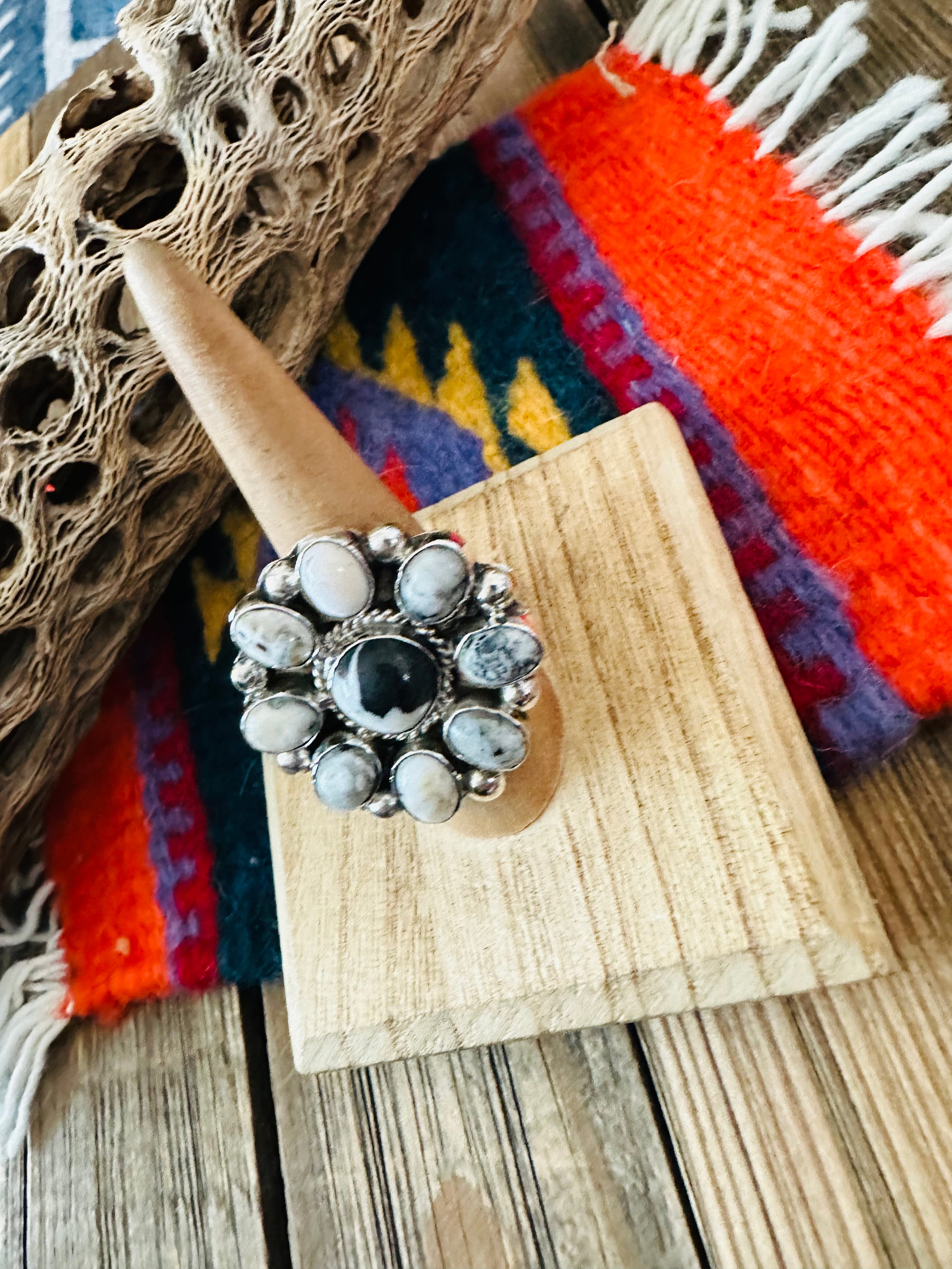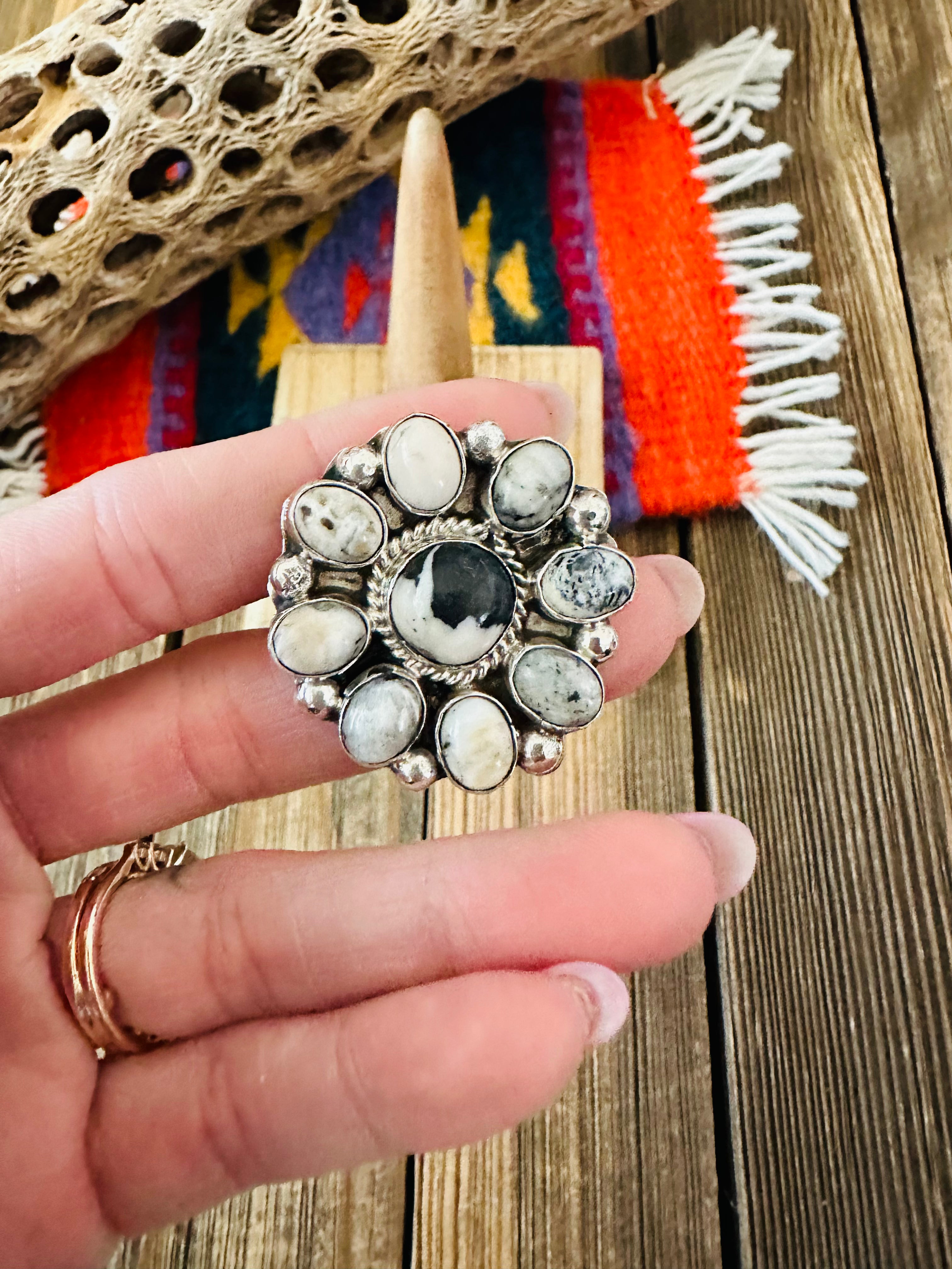 Beautiful Navajo White Buffalo And Sterling Silver Cluster Ring. Size is adjustable. Measuring 1 1/2 inches wide. Signed by the artist and stamped Sterling. Such a pretty ring!