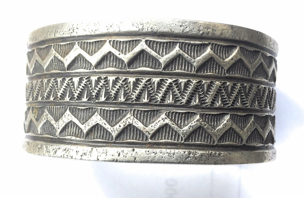 1-1/4 inches wide, so it has good presence but can definitely still be just one piece of your stack. The inside circumference is 5-5/8 inches plus a gap of 1-1/8 inches making a total measurement of 6-3/4 inches. It is signed by the artist, Stewart Billie, and stamped sterling.