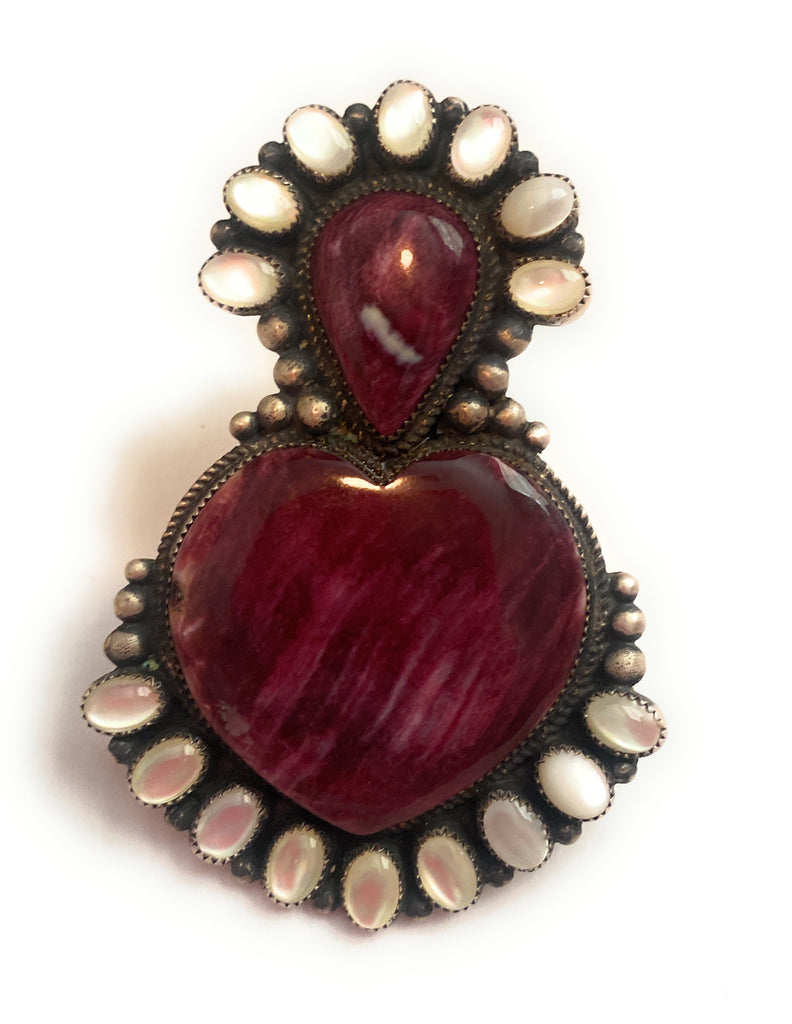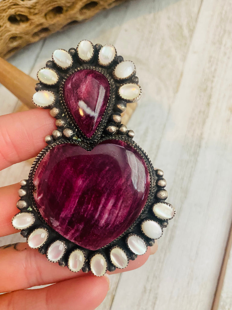 Gorgeous Navajo Sterling Silver, Purple Spiny Oyster Shell and Mother of Pearl Cluster Ring. Size is adjustable. Such pretty stones in this ring! Signed by the artist and stamped Sterling. Ring measures 3 1/4 inches long and 2 inches wide.