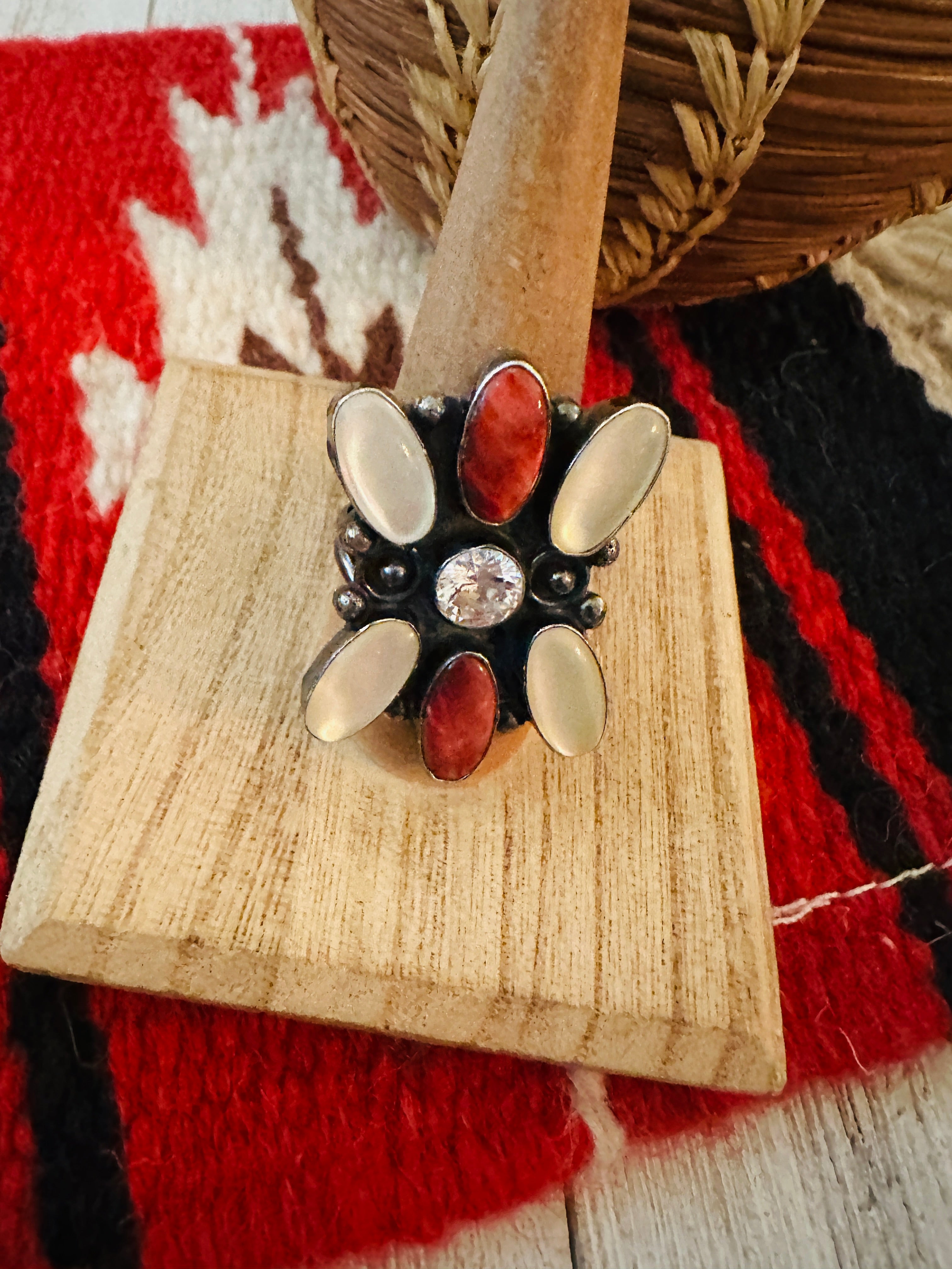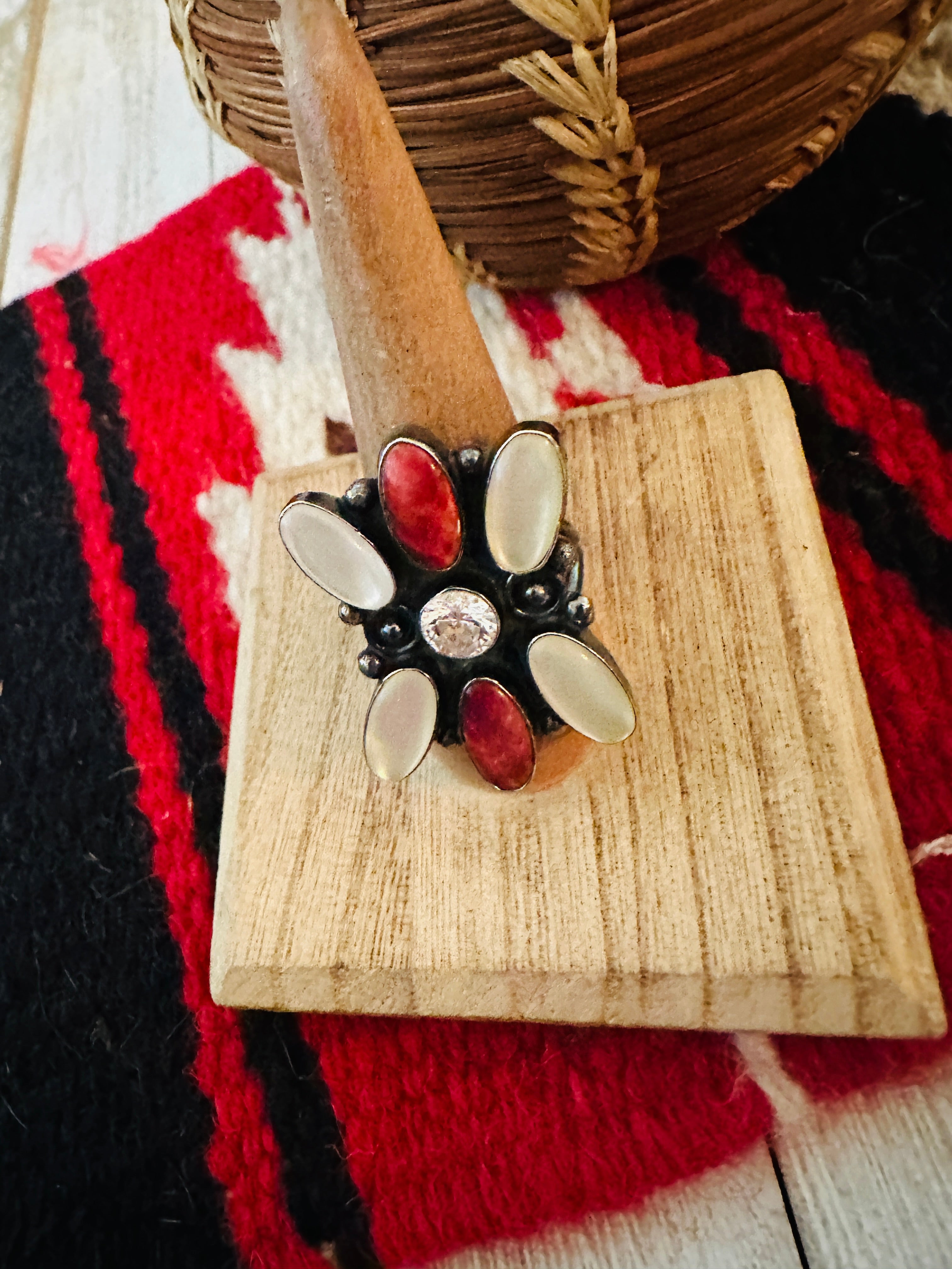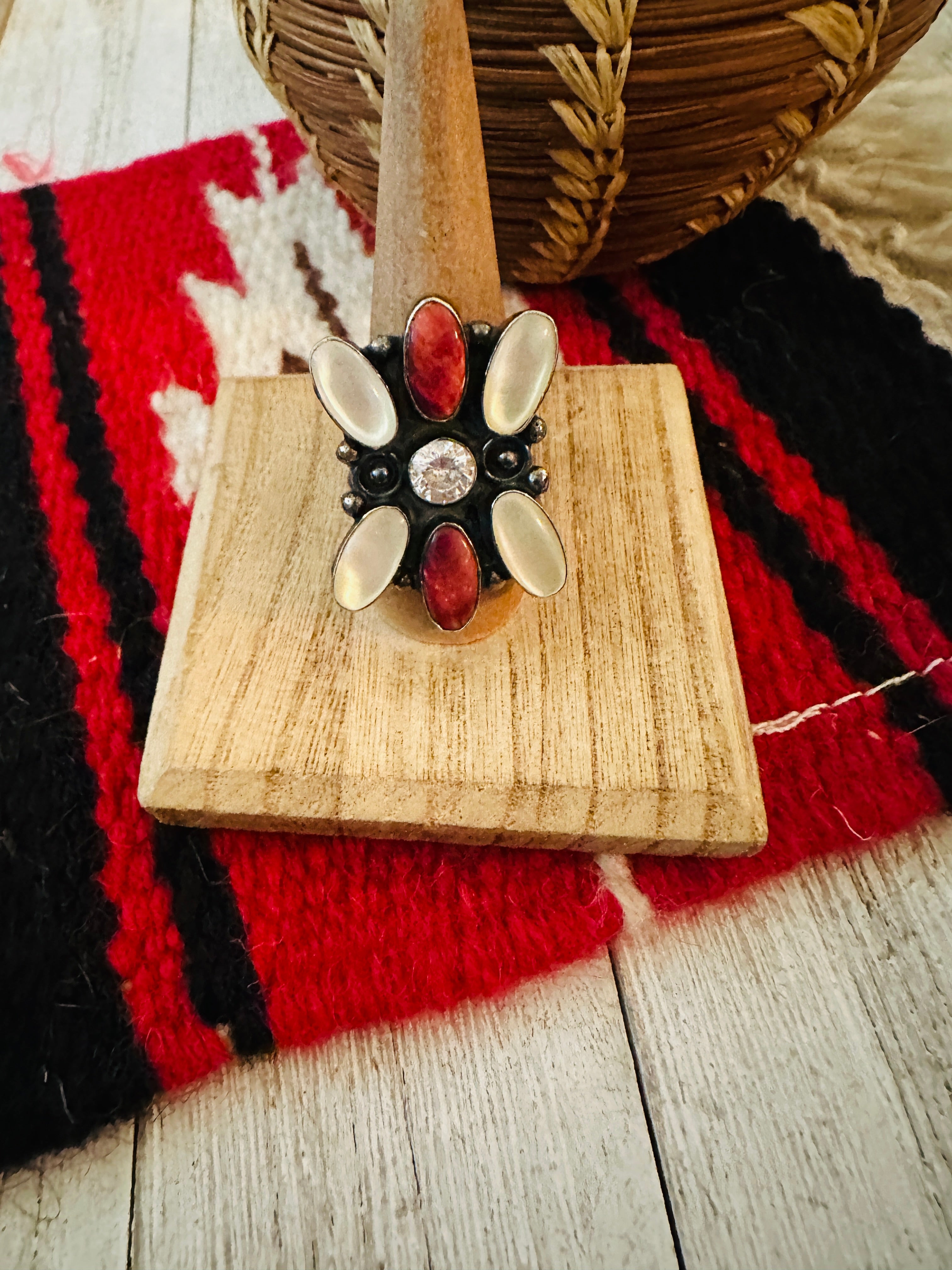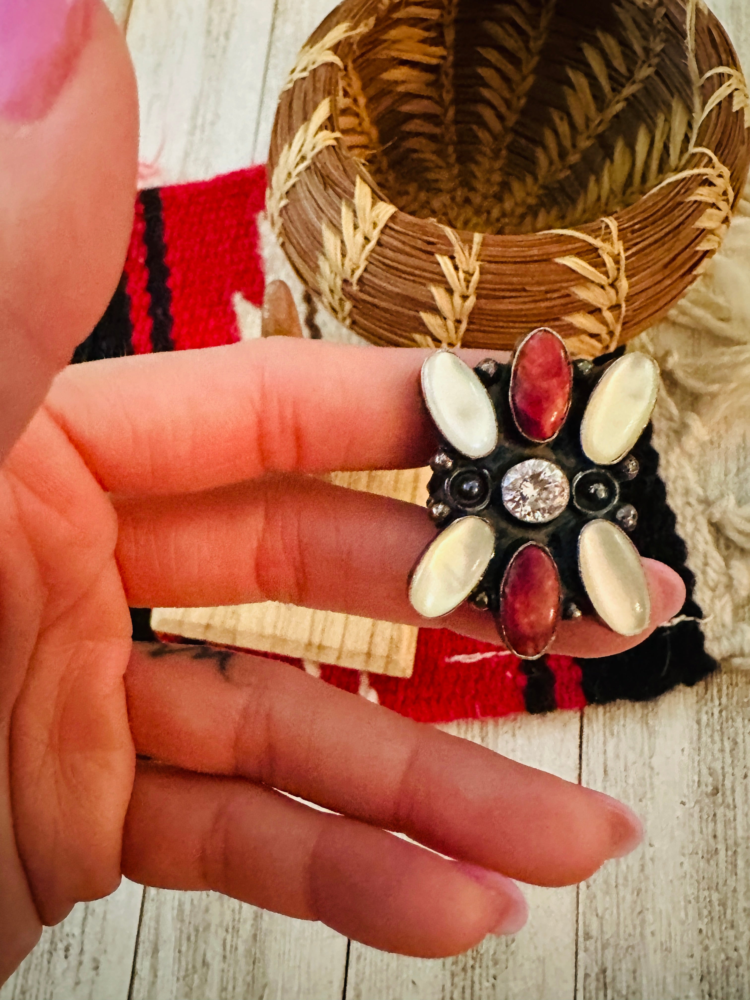 Navajo Sterling Silver, Mother of Pearl, Spiny & CZ Cluster Ring Size 9
