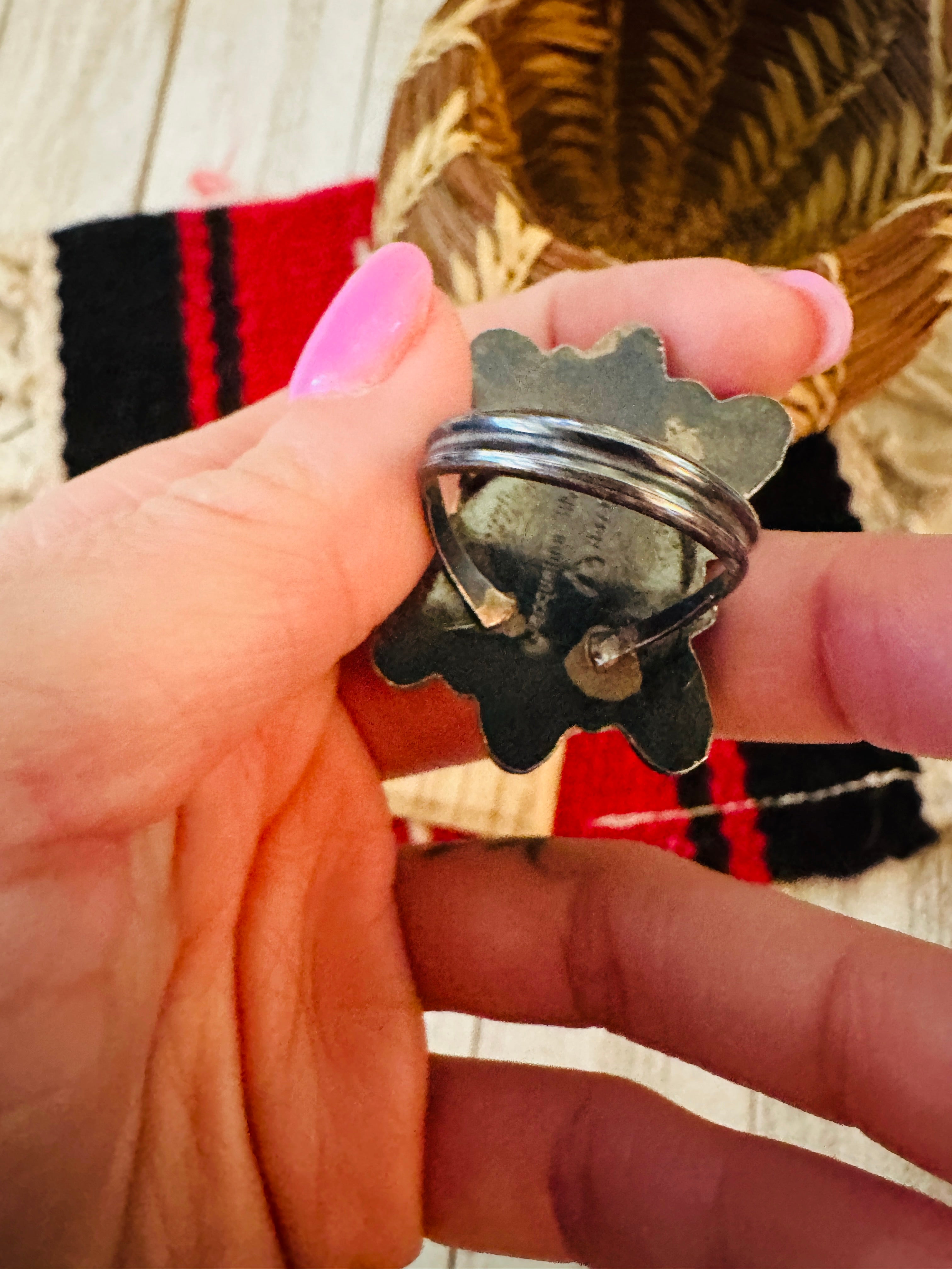 Navajo Sterling Silver, Mother of Pearl, Spiny Oyster Shell and CZ Cluster Ring. Size 9. Such amazing craftsmanship! Signed by the artist Jacqueline Silver and stamped Sterling. Ring face measures 1 1/2 inches long and 1 inch wide.