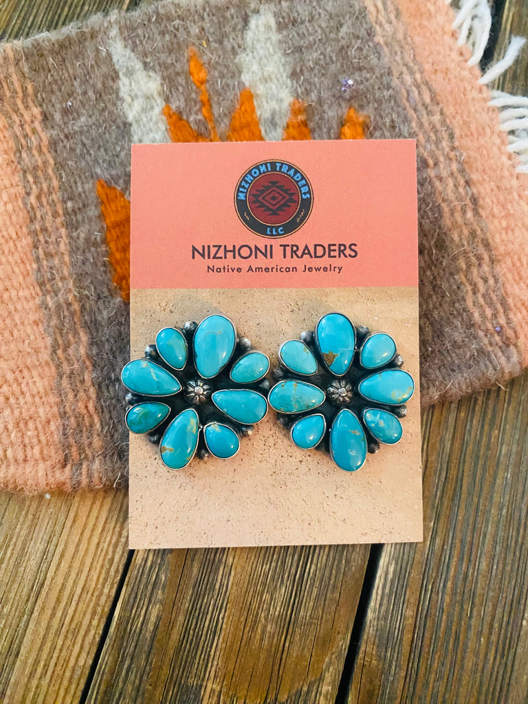 These are a beautiful pair of Navajo Sterling Silver and Natural Turquoise cluster post earrings. These measure 1 3/8 inches long and 1 1/4 inches wide. Beautiful bright blue stones! Stamped Sterling.