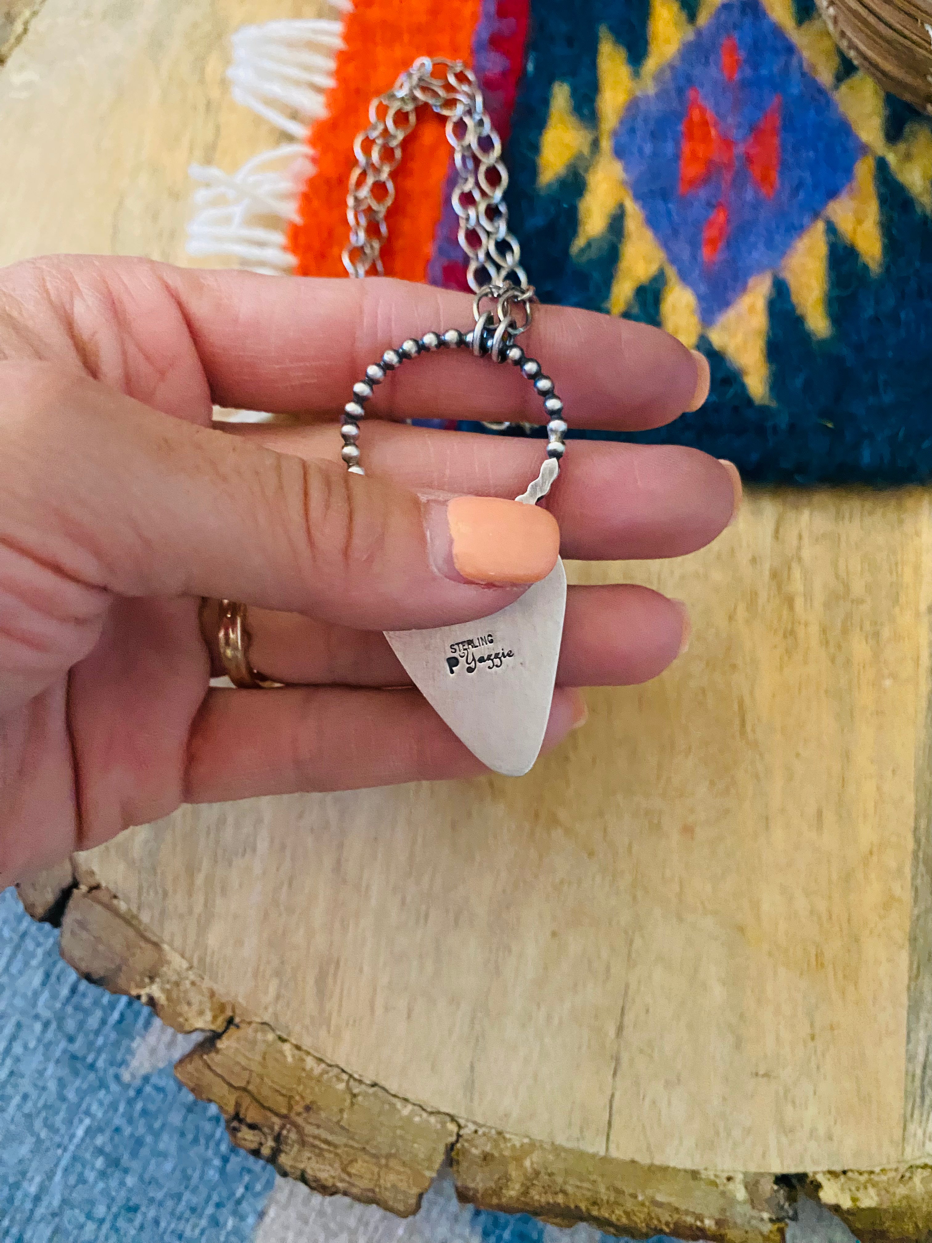 Beautiful Navajo Sterling Silver and Sonoran Mountain Turquoise Necklace. Sterling chain is 18 inches long but is adjustable. Pendant measures 2 1/4 inches long and 1 inch wide. Signed by the artist Patrick Yazzie and stamped Sterling.