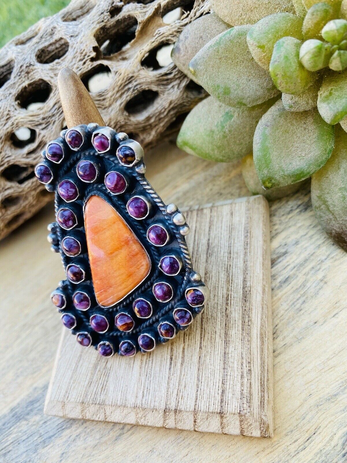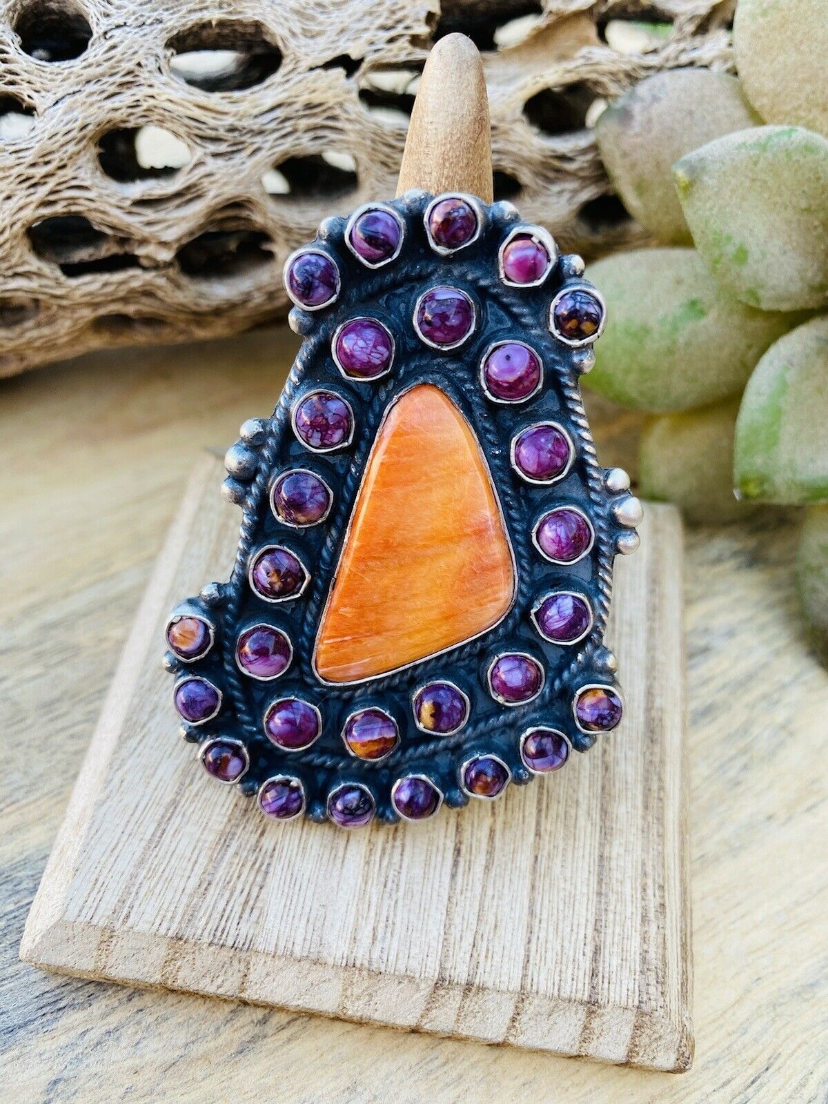 Lovely Handmade Sterling Silver, Orange and Purple Spiny Oyster Cluster Ring Size 7.5. Such pretty stones in this ring! Signed by the artist and stamped Sterling. Ring measures 2 1/2 inches long and 1 7/8 inches wide.