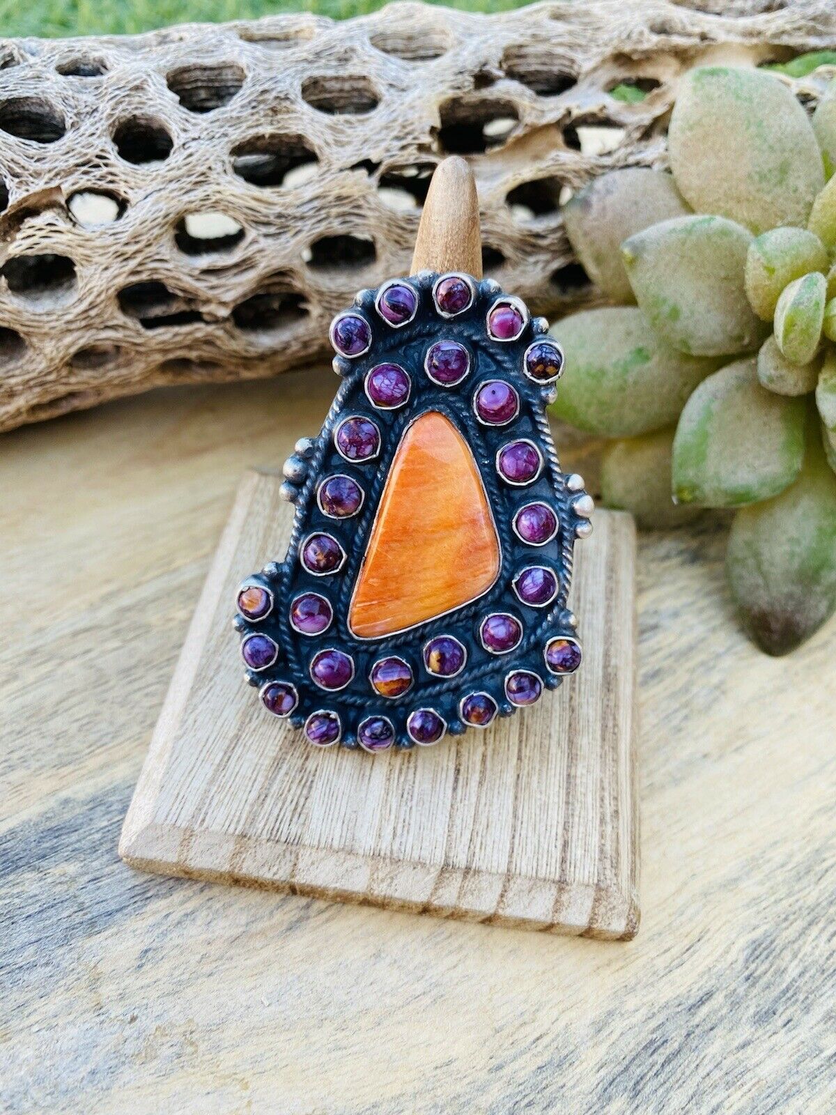 Handcrafted Sterling Silver & Purple & Orange Spiny Cluster Ring Size 7.5