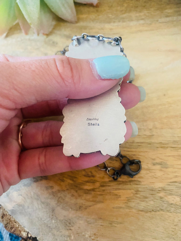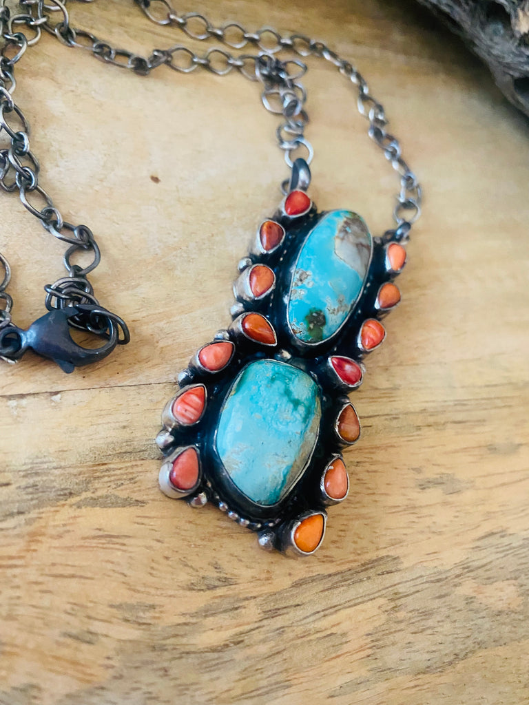 Beautiful Navajo Royston Turquoise, Orange Spiny Oyster Shell and Sterling Silver Cluster Necklace. Gorgeous stones in this necklace! Sterling chain measures 20 inches long. Pendant is 2 1/2 inches long and 1 1/4 inches wide. Signed by the artist Sheila and stamped Sterling.