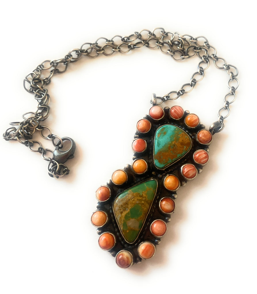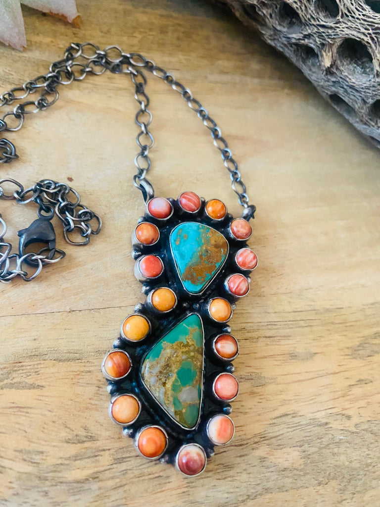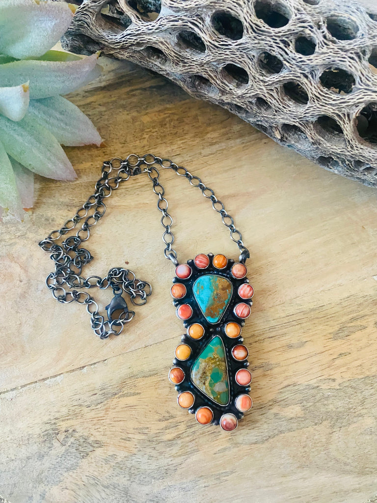 Beautiful Navajo Royston Turquoise, Orange Spiny Oyster Shell and Sterling Silver Cluster Necklace. Gorgeous stones in this necklace! Sterling chain measures 20 inches long. Pendant is 2 3/4 inches long and 1 1/4 inches wide. Signed by the artist Sheila and stamped Sterling.