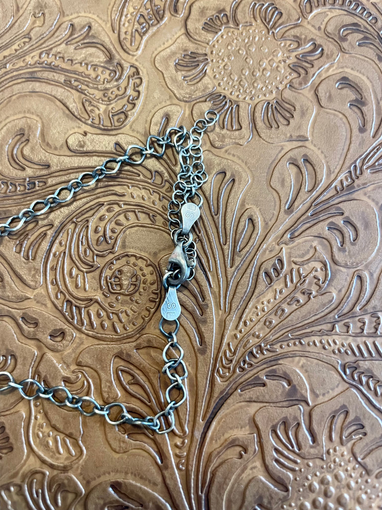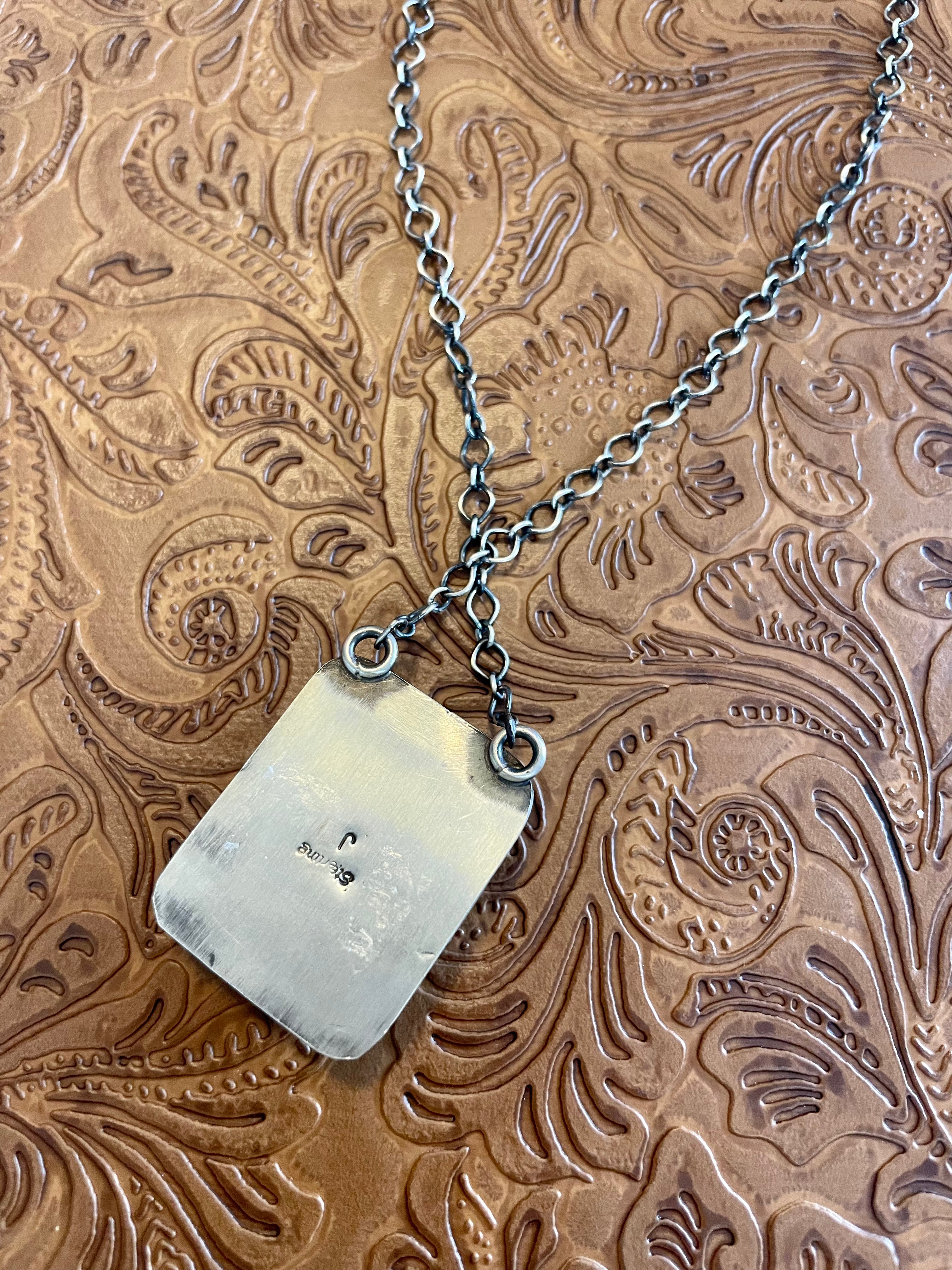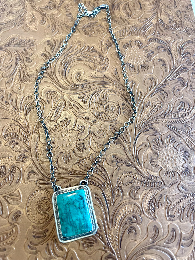 What a beautiful necklace this Navajo Sterling Silver and Tibetan Turquoise Necklace is! Necklace is 18 inches long with an additional 1 1/4 for the Tibetan Turquoise pendant. Necklace is adjustable in length. Signed & Stamped.
