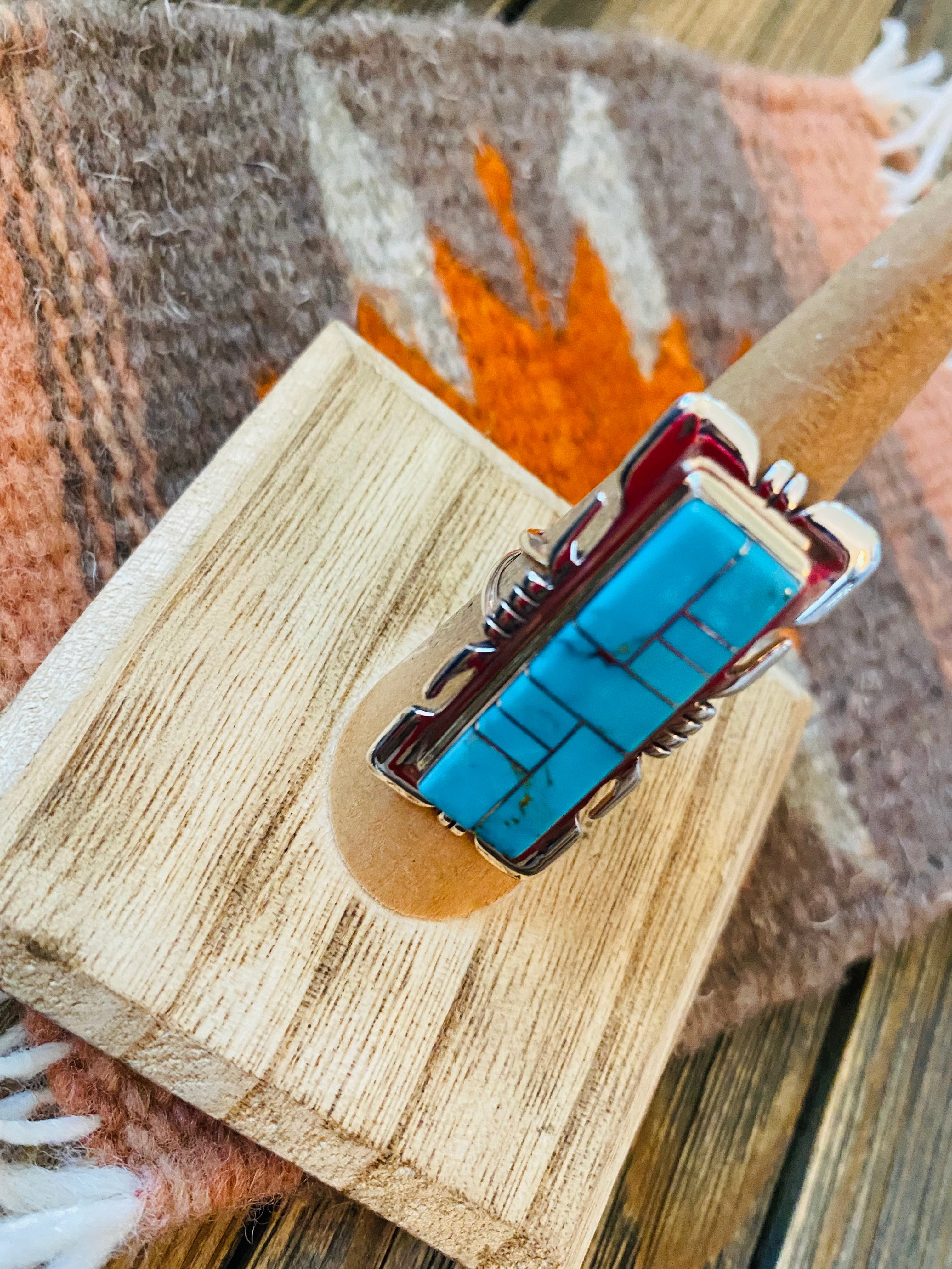 Gorgeous Navajo Turquoise and Sterling Silver Rectangle Inlay Ring. Size 6.5. Beautiful craftsmanship! Signed by the artist. Ring face measures 1 5/8 inches long and just under 1 inch wide.