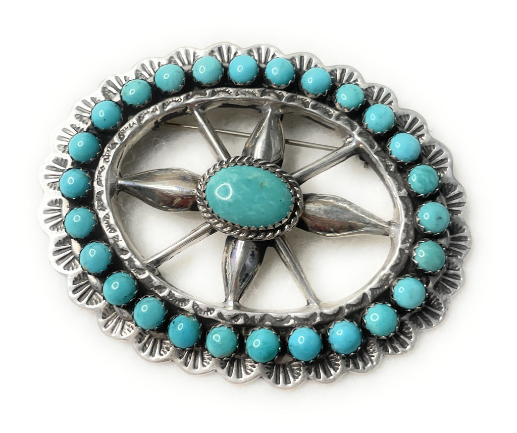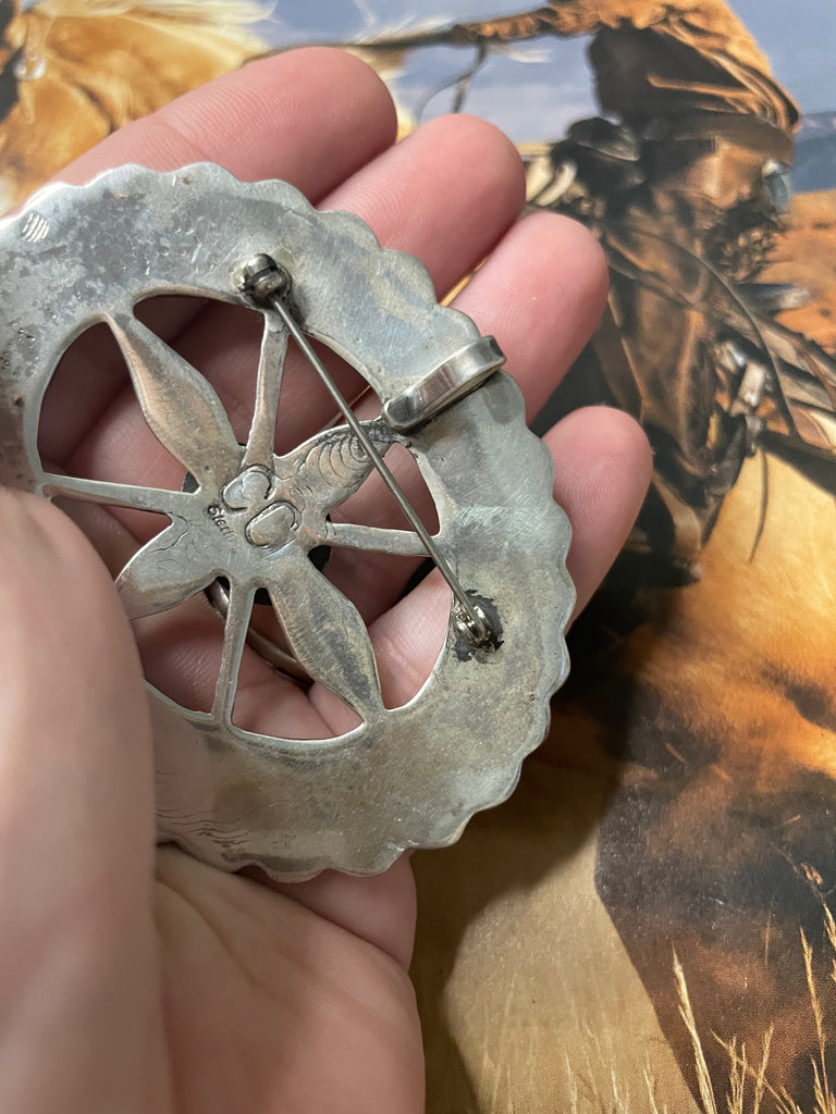 Beautiful Navajo Turquoise and Sterling Silver Pendant Pin. Beautiful hand stamped Sterling silver. Signed by the artist and stamped Sterling. This pendant measures just under 3 inches wide and 2 1/4 inches long. Such a pretty piece!