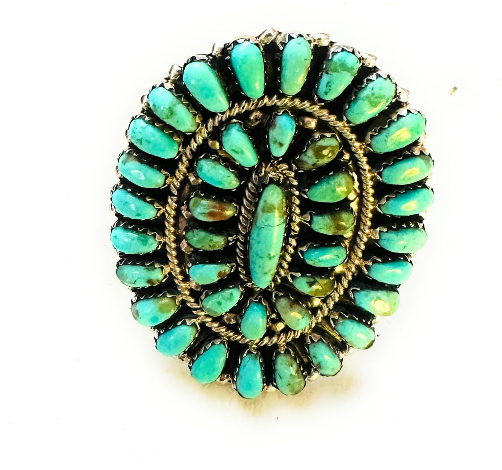 Gorgeous Navajo Turquoise and Sterling Silver Cluster Ring. Size is adjustable. Such amazing craftsmanship! Ring measures 1 7/8 inches long and 1 5/8 inches wide. Stamped Sterling and signed by the artist.