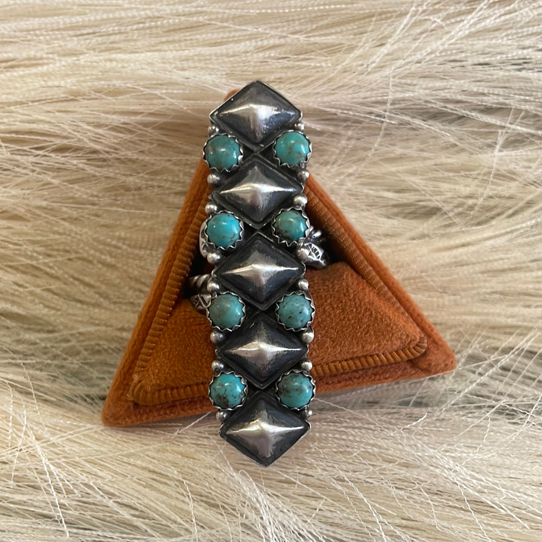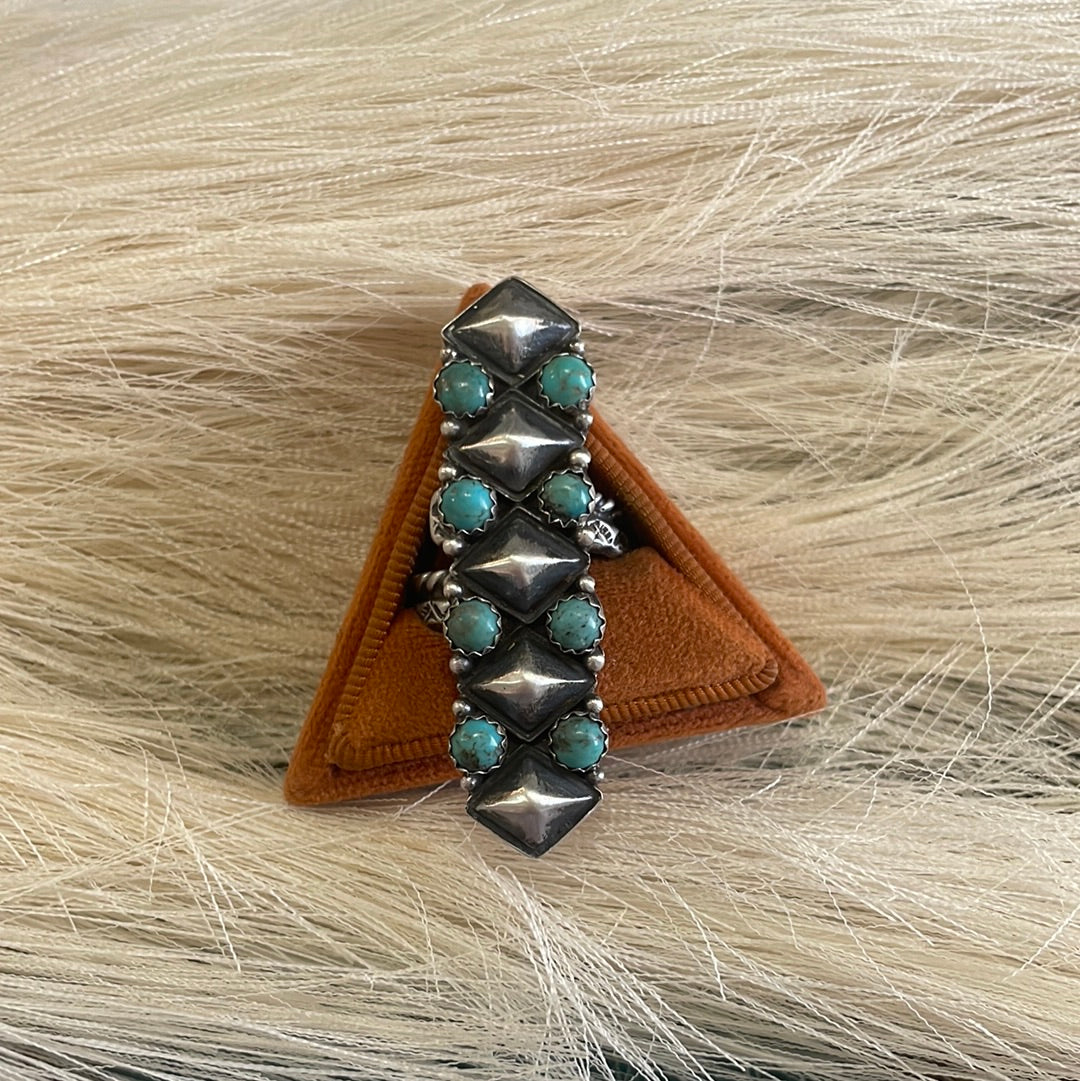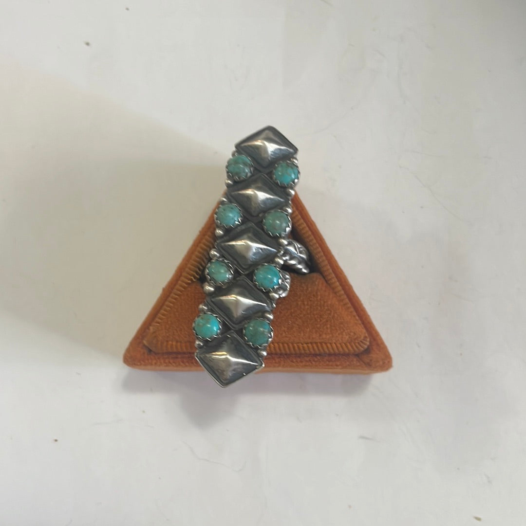 Gorgeous Handcrafted Turquoise Sterling Silver Ring. Size is adjustable. Delightful colors in this awesome piece! This wonderful ring measures 2 1/8 inches long and 1/2 inch wide. Signed by the artist Russell Sam & stamped Sterling.