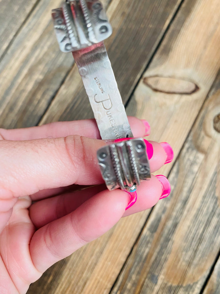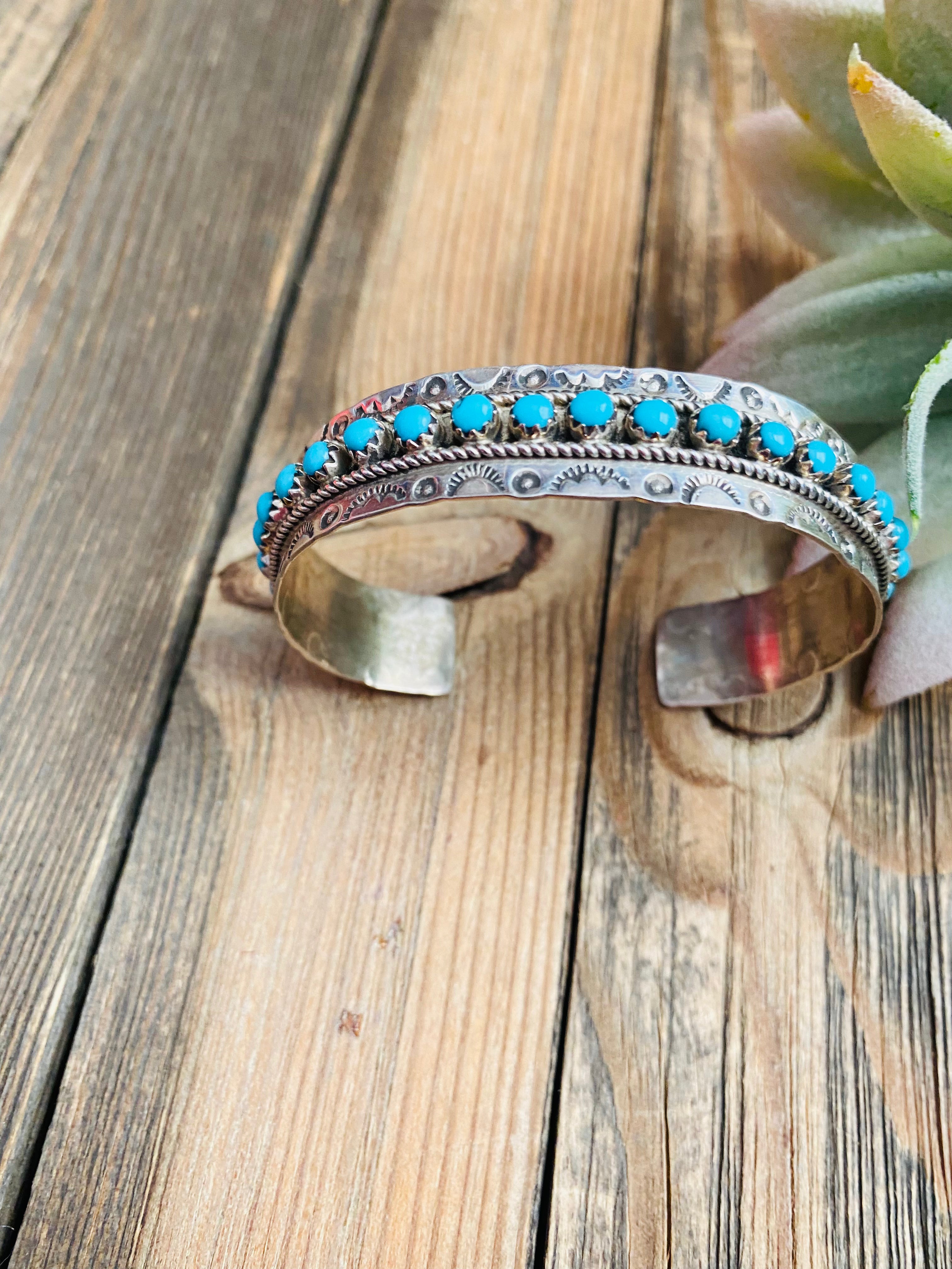 Beautiful Navajo Turquoise and Sterling Silver Cuff Bracelet. Such amazing craftsmanship! Cuff has an inside circumference of 5 7/8 inches with a 1 inch gap. Width is 1/2 is an inch. Signed by the artist and stamped Sterling. Stamp work may vary slightly.