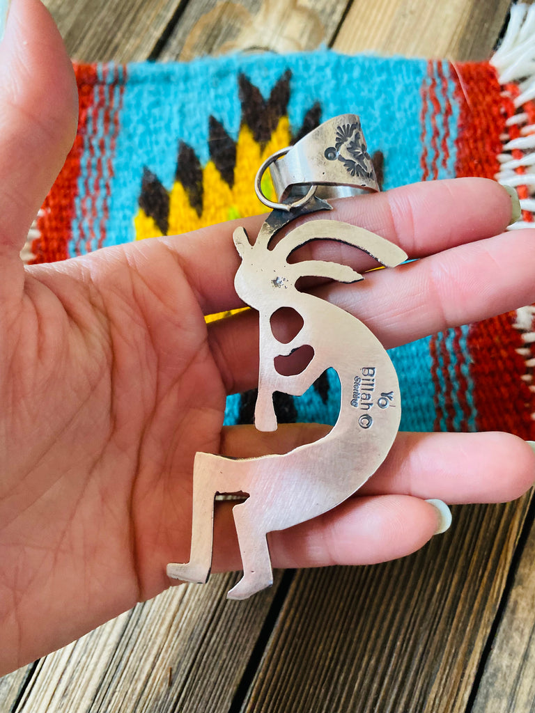 Beautiful Navajo Turquoise and Sterling Silver Kokopelli Pendant. Amazing silver work on this pendant! This piece measures 4 inches long and 1 1/2 inches wide. Bale measures 3/4 of an inch across. Signed by the artist Kevin Billah and stamped Sterling. Such an amazing piece!
