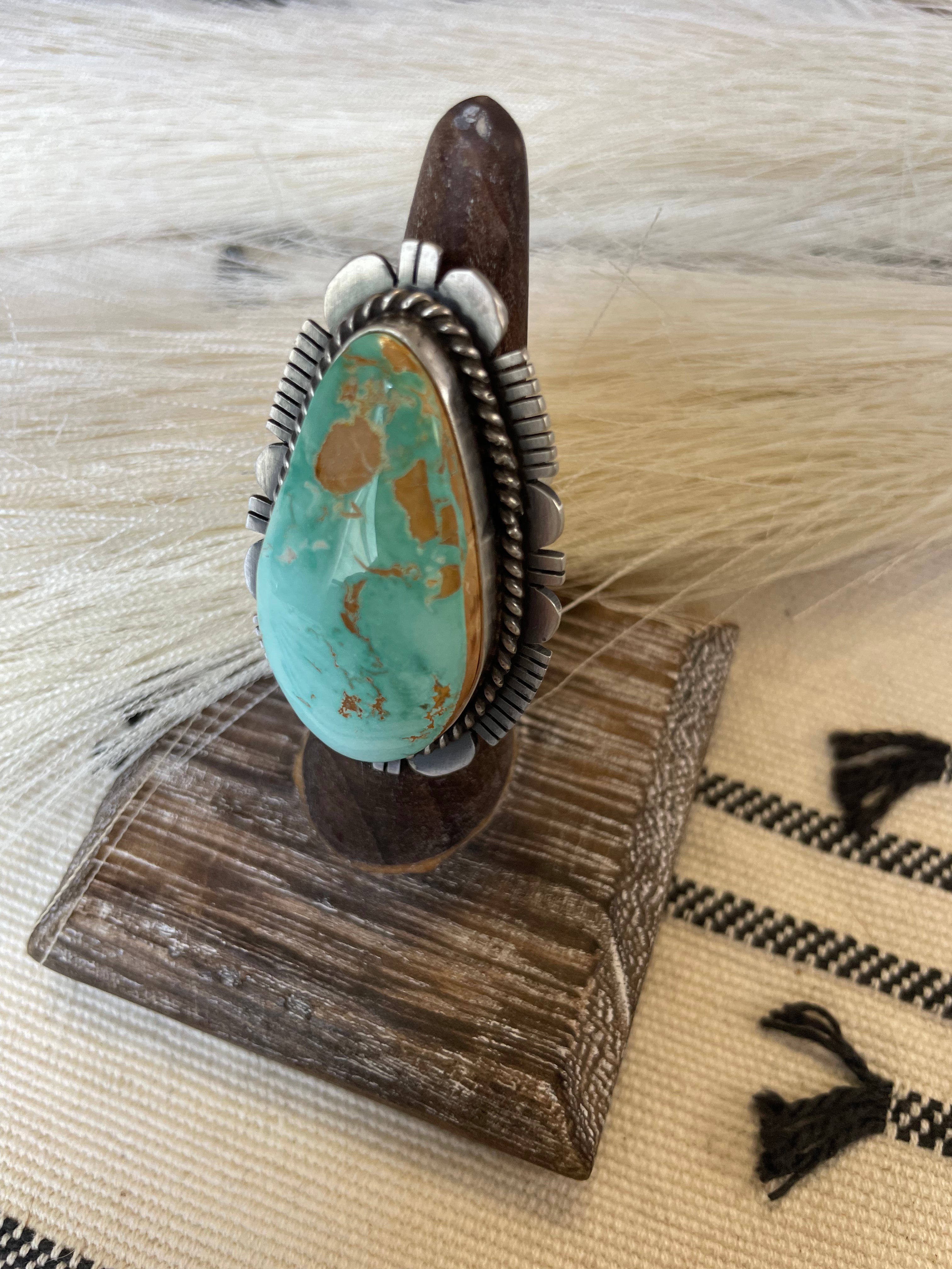 Awesome Navajo Sterling Silver and Turquoise Statement ring. Such a cool design! Size 7. Measuring 2 inches in length and 1 1/4 inch wide. Signed by the artist Russell Sam and stamped Sterling. Really great looking piece.