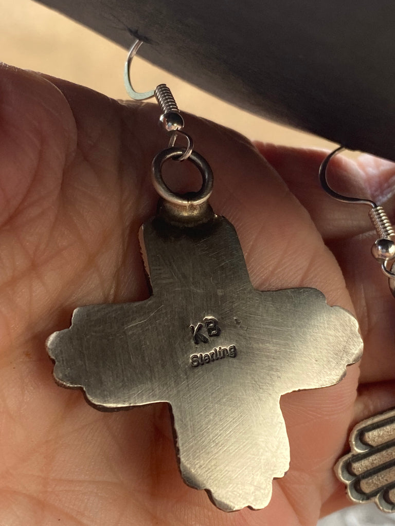 Beautiful Navajo Turquoise and Sterling Silver Zia Dangle Earrings. These lovely earrings measure 2 1/4 inches long and 1 1/4 inches wide. Signed by the artist Kevin Billah and stamped Sterling. Such a pretty pair!
