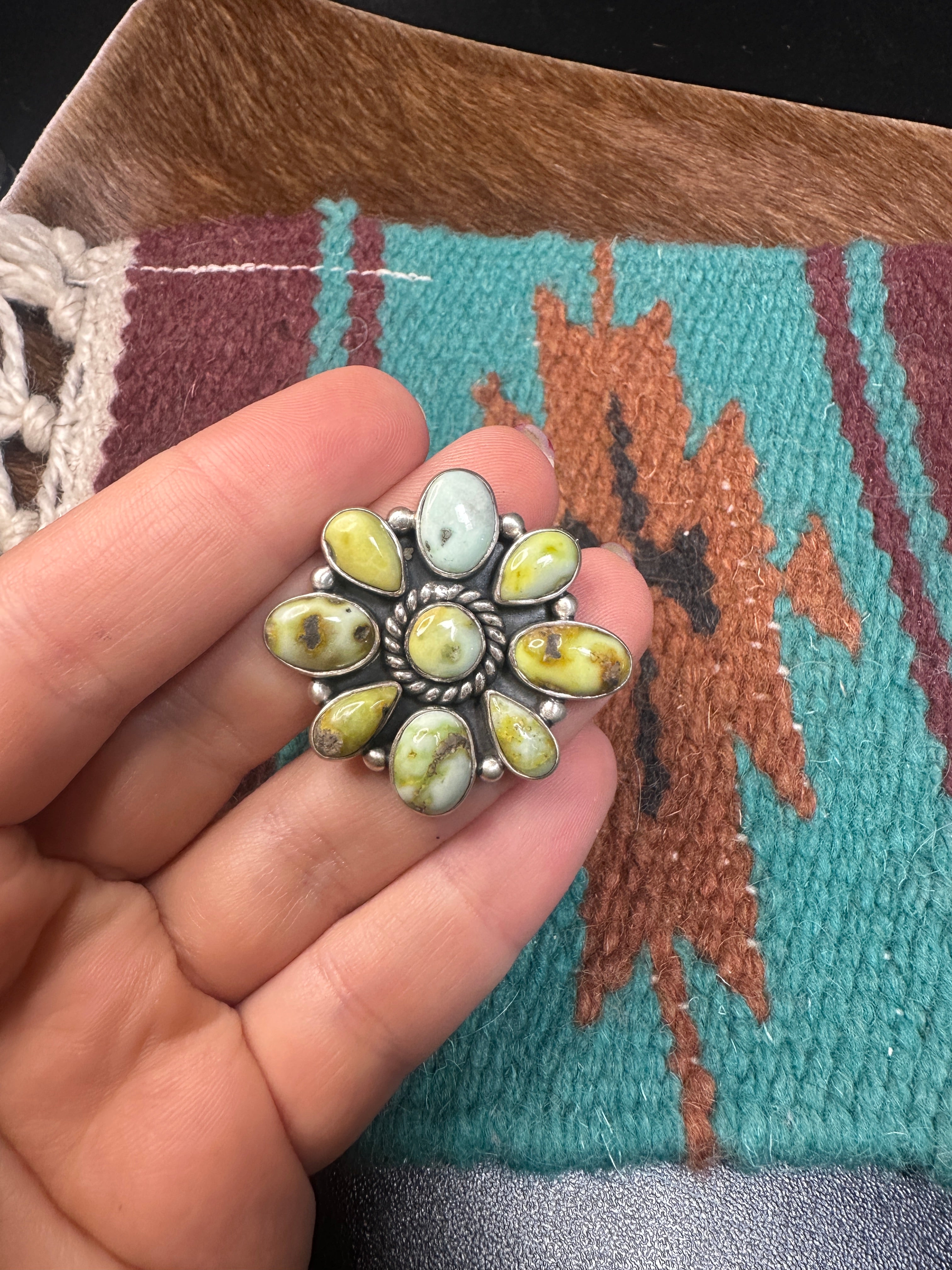 Check out our incredible Nizhoni handmade Palomino Turquoise adjustable flower cluster ring. This beautiful ring is stamped sterling & signed Nizhoni. This beautiful piece measures 1 3/8 inches long and 1 3/8 inch wide. This listing is for 1 ring only.