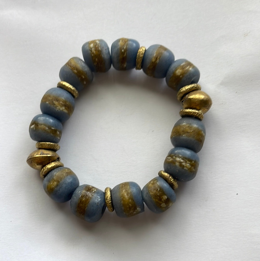 Handmade Recycled Glass Beaded Stretch Bracelet BLUE & GOLD