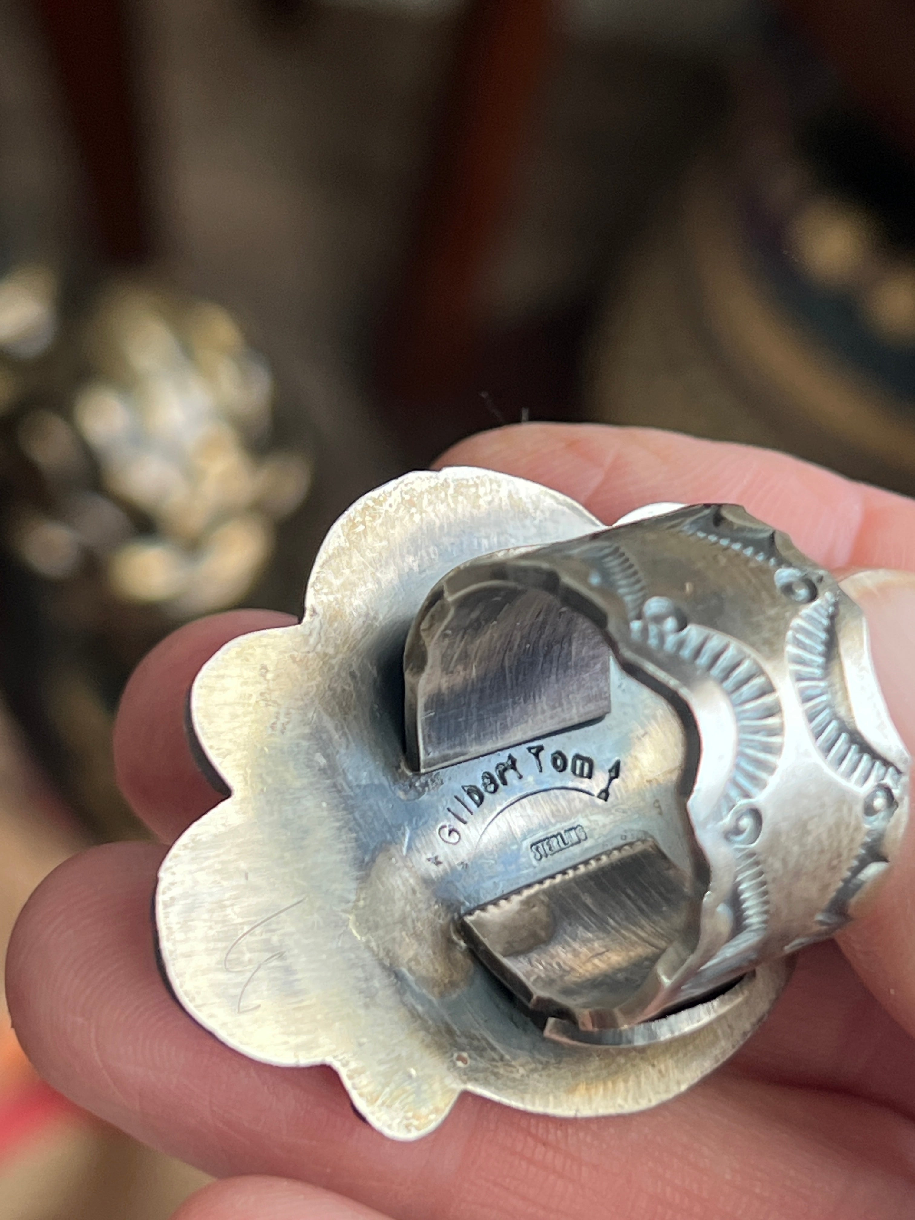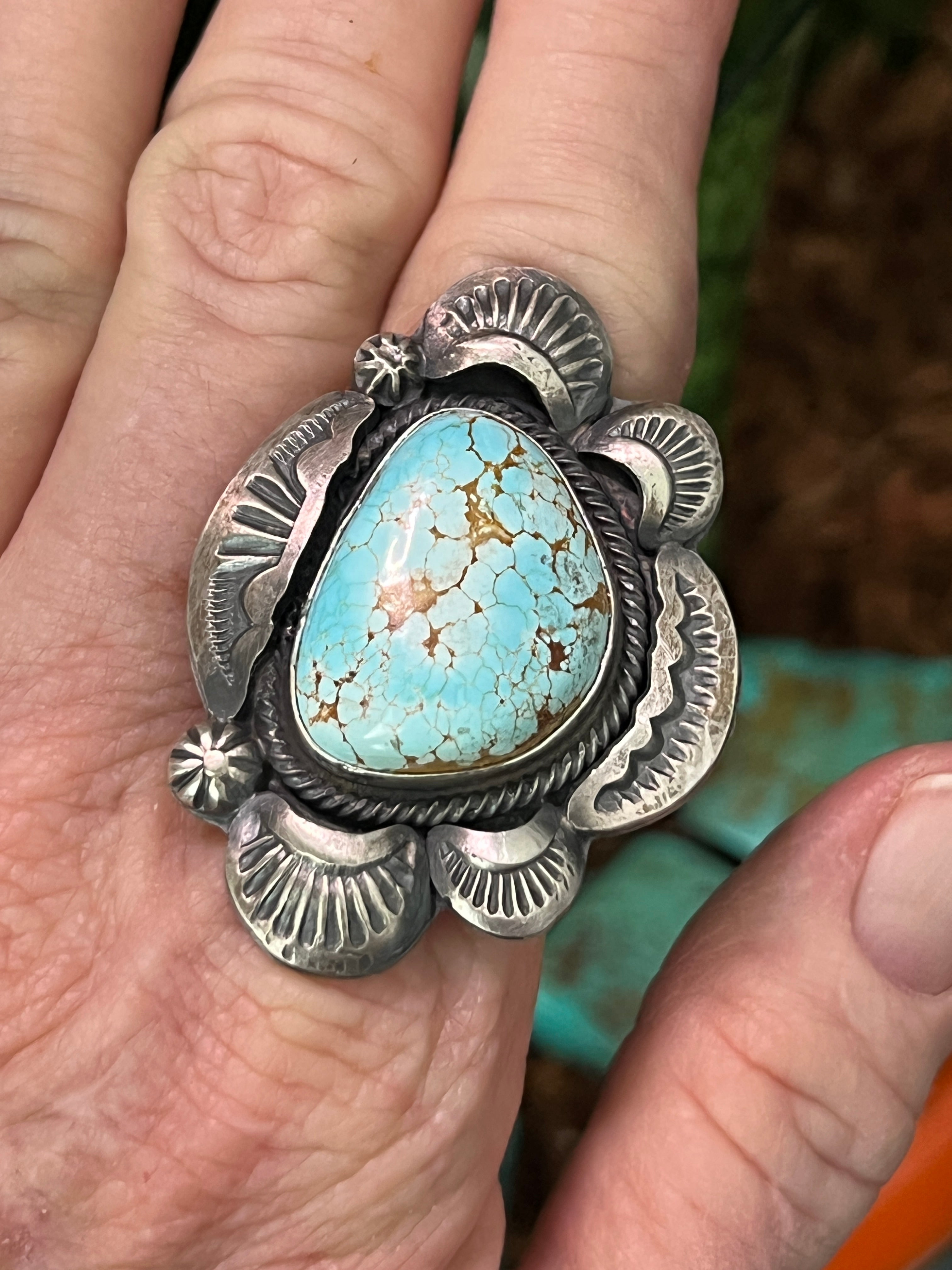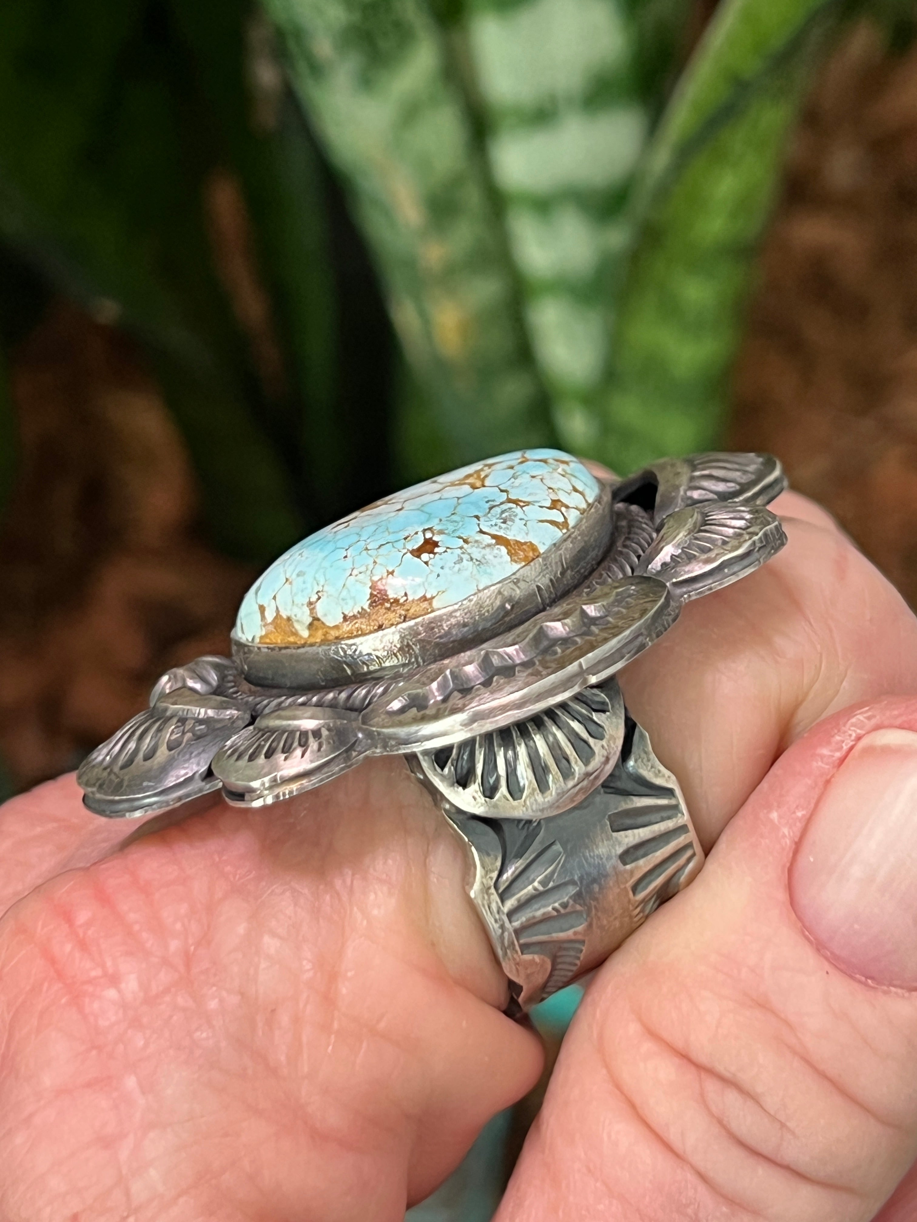 This gorgeous sterling silver ring made by silversmith, Gilbert Tom, features a stunning piece of Number 8 turquoise bordered with assorted shaped details that add depth to the design. The 14mm fixed (non-adjustable) hand stamped shank will fit a size 10.5 finger. The face measures 2 inches x 1-3/8 inches.