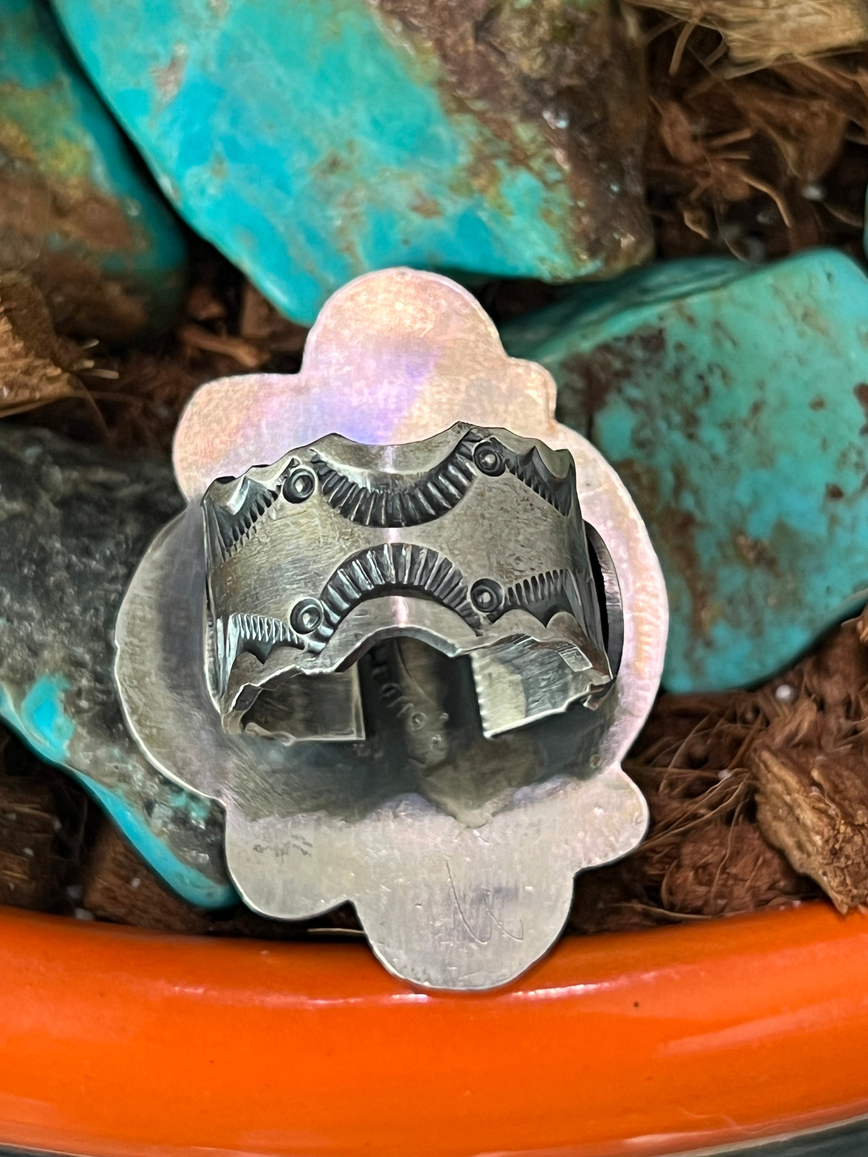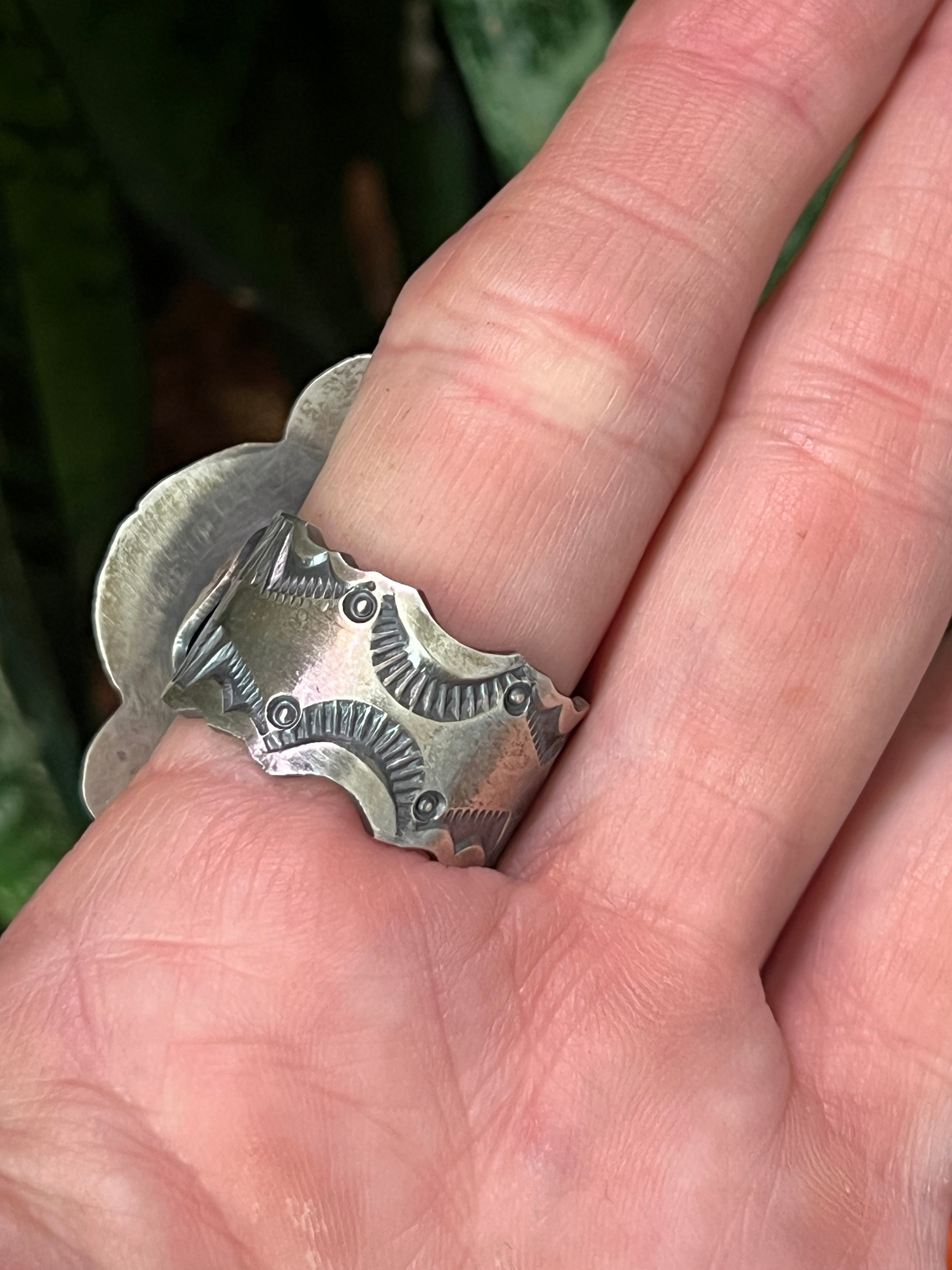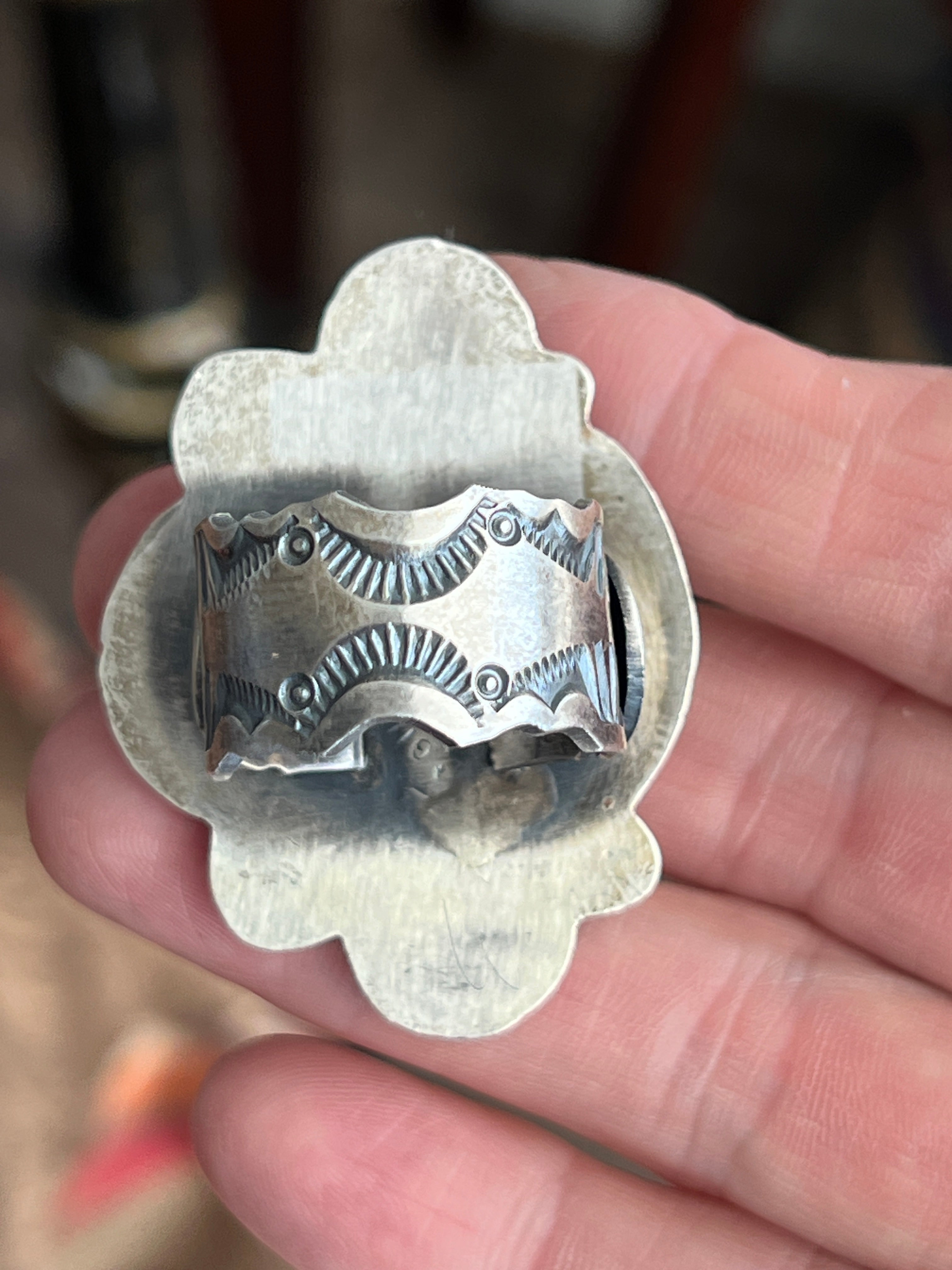 This gorgeous sterling silver ring made by silversmith, Gilbert Tom, features a stunning piece of Number 8 turquoise bordered with assorted shaped details that add depth to the design. The 14mm fixed (non-adjustable) hand stamped shank will fit a size 10.5 finger. The face measures 2 inches x 1-3/8 inches.