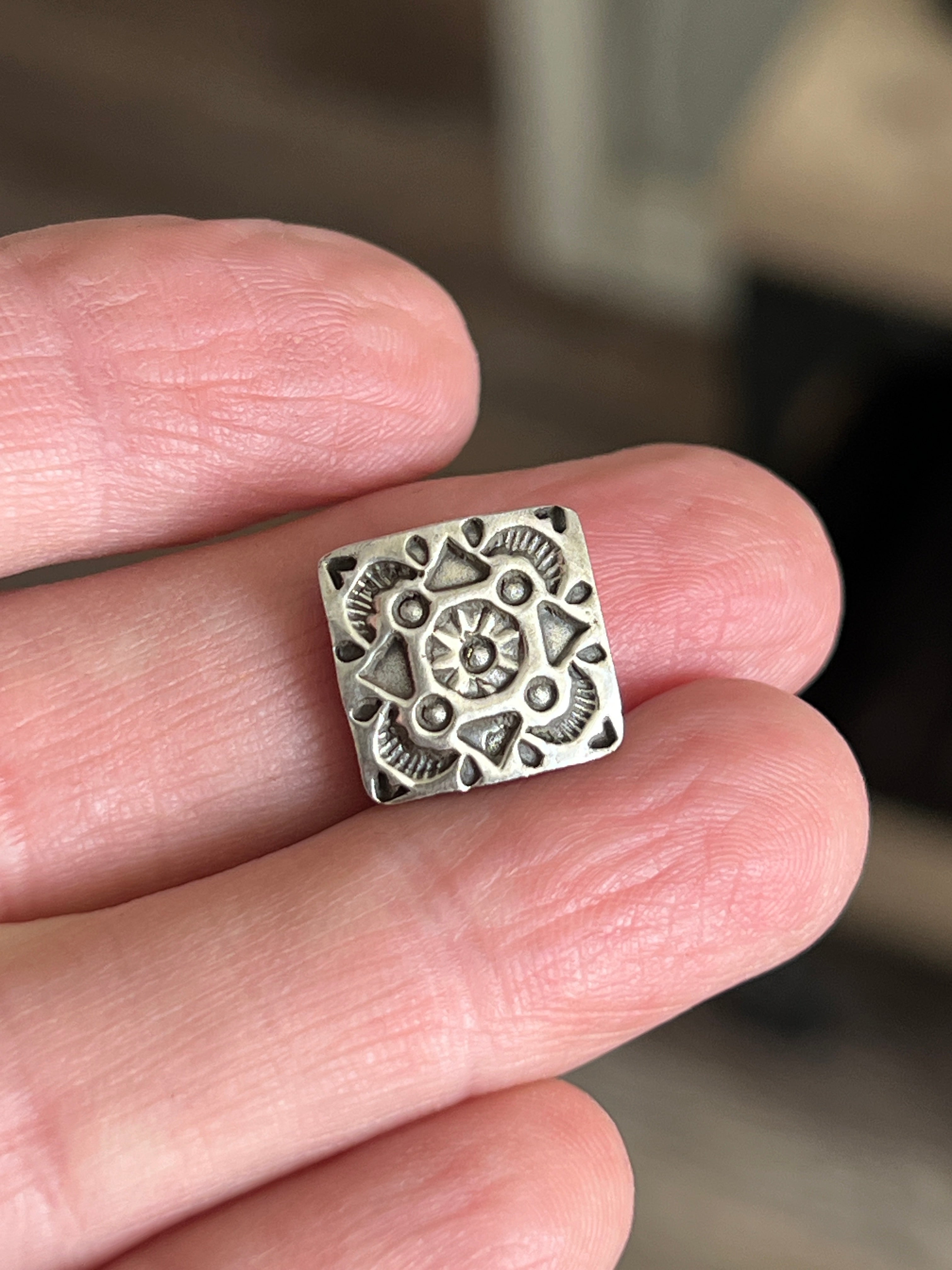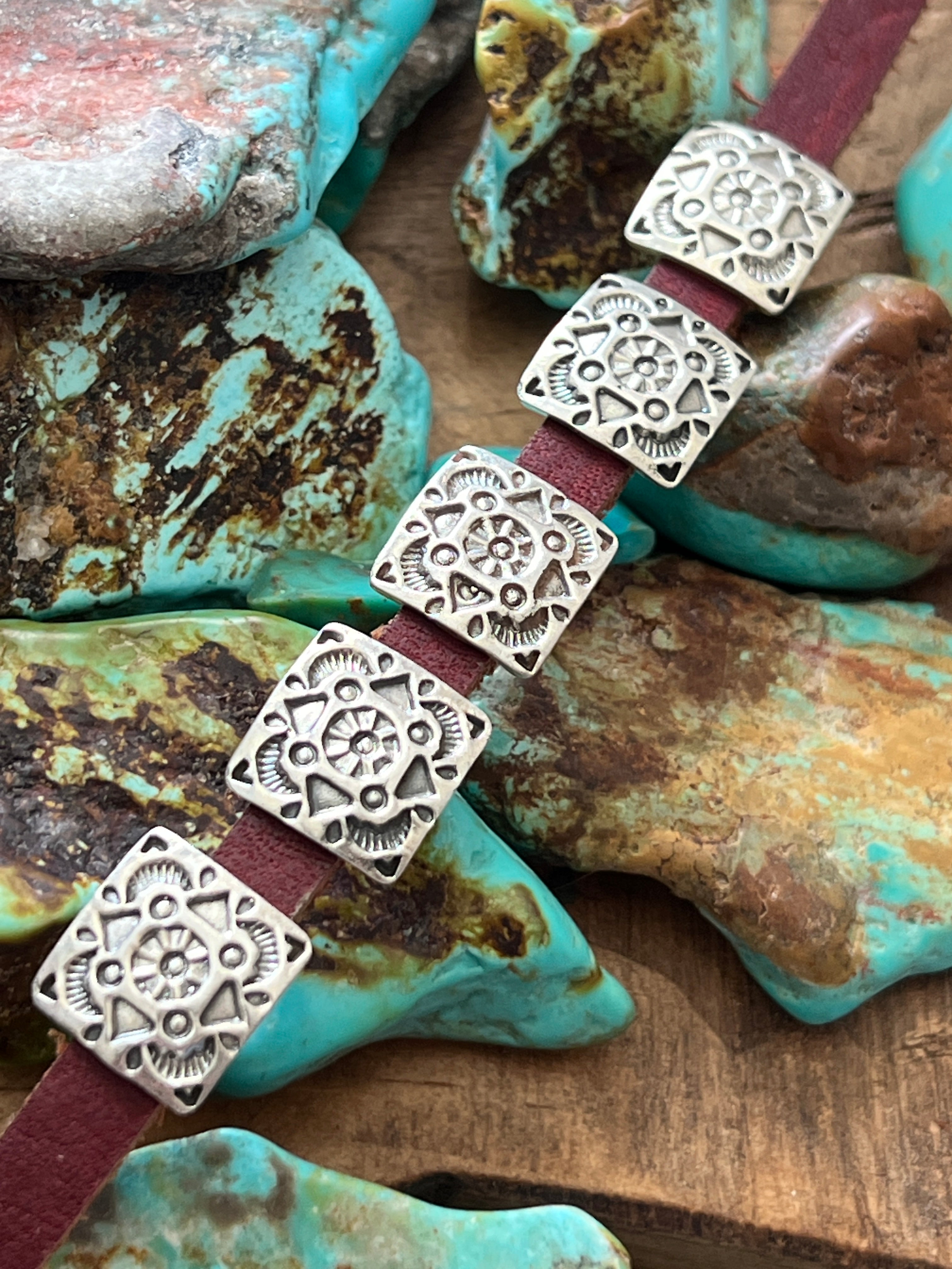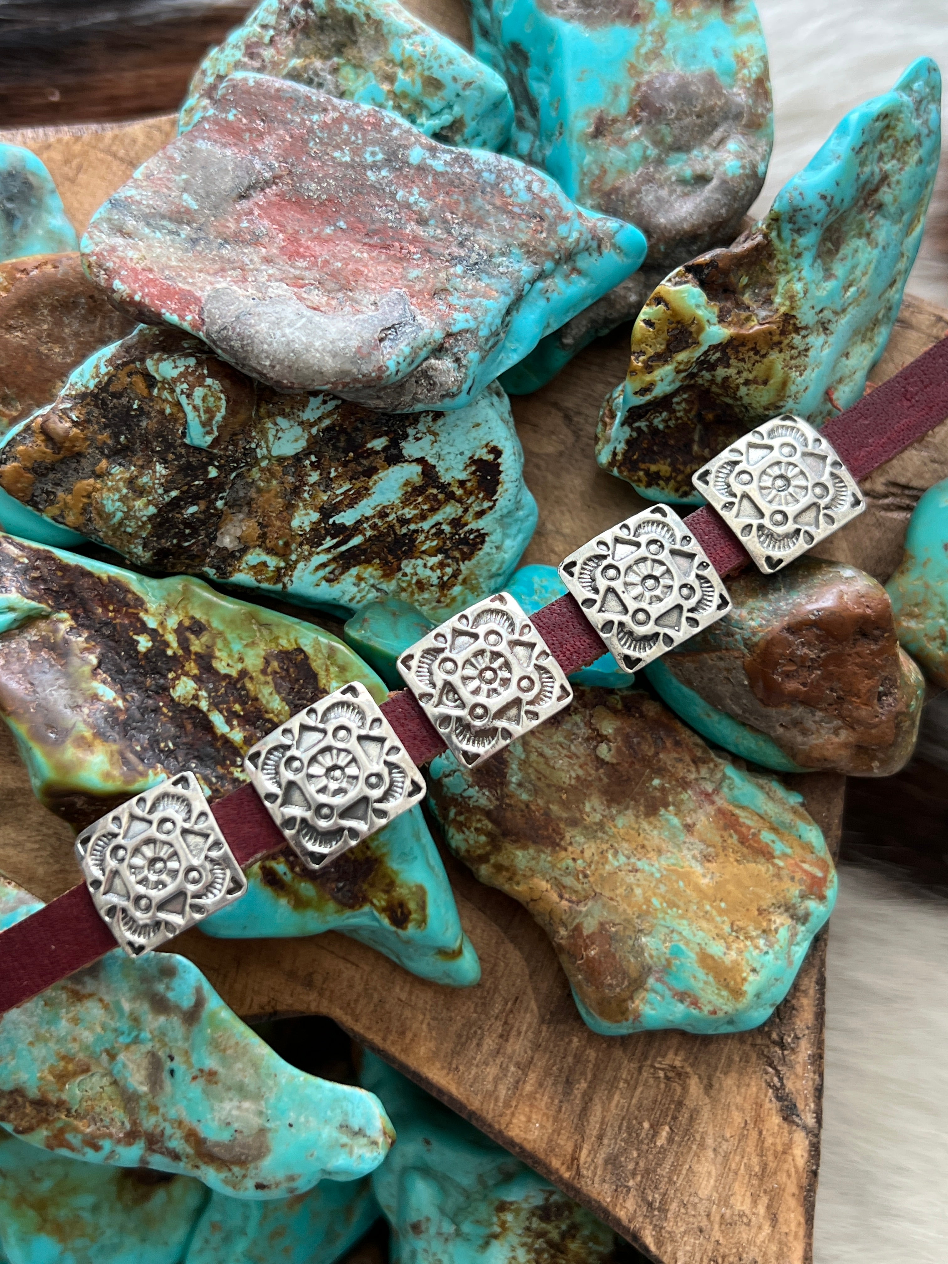These mini sterling silver slide conchos are perfect for your leather bracelet & hat band projects! Each one measures 1/2 inch by 1/2 inch. Slide bars are base metal. Make sure to search “Concho Slide” to see all styles available. This listing is for one piece.
