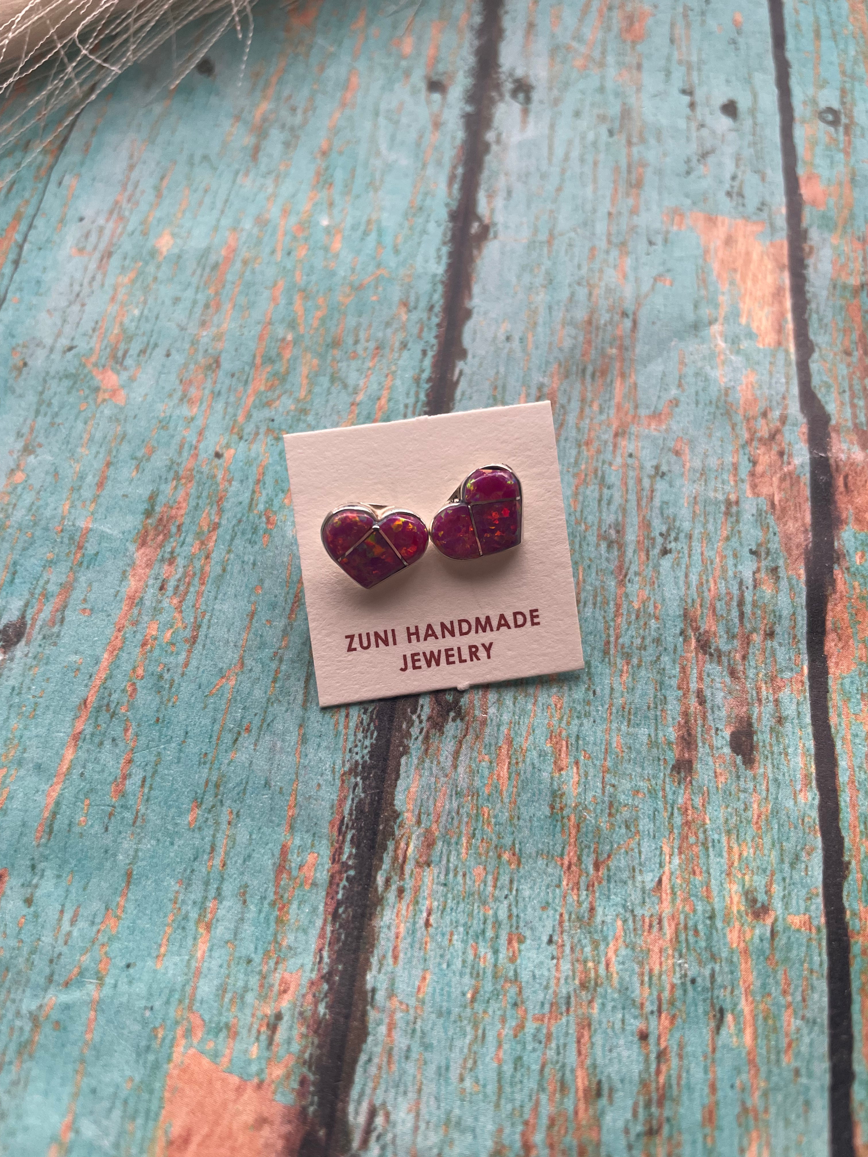 These are a pair of Zuni Sterling Silver and Pink Opal Inlay Heart Stud Earrings. These beauties measure 1/4 of an inch studs. Very comfortable for everyday wear. Will vary!