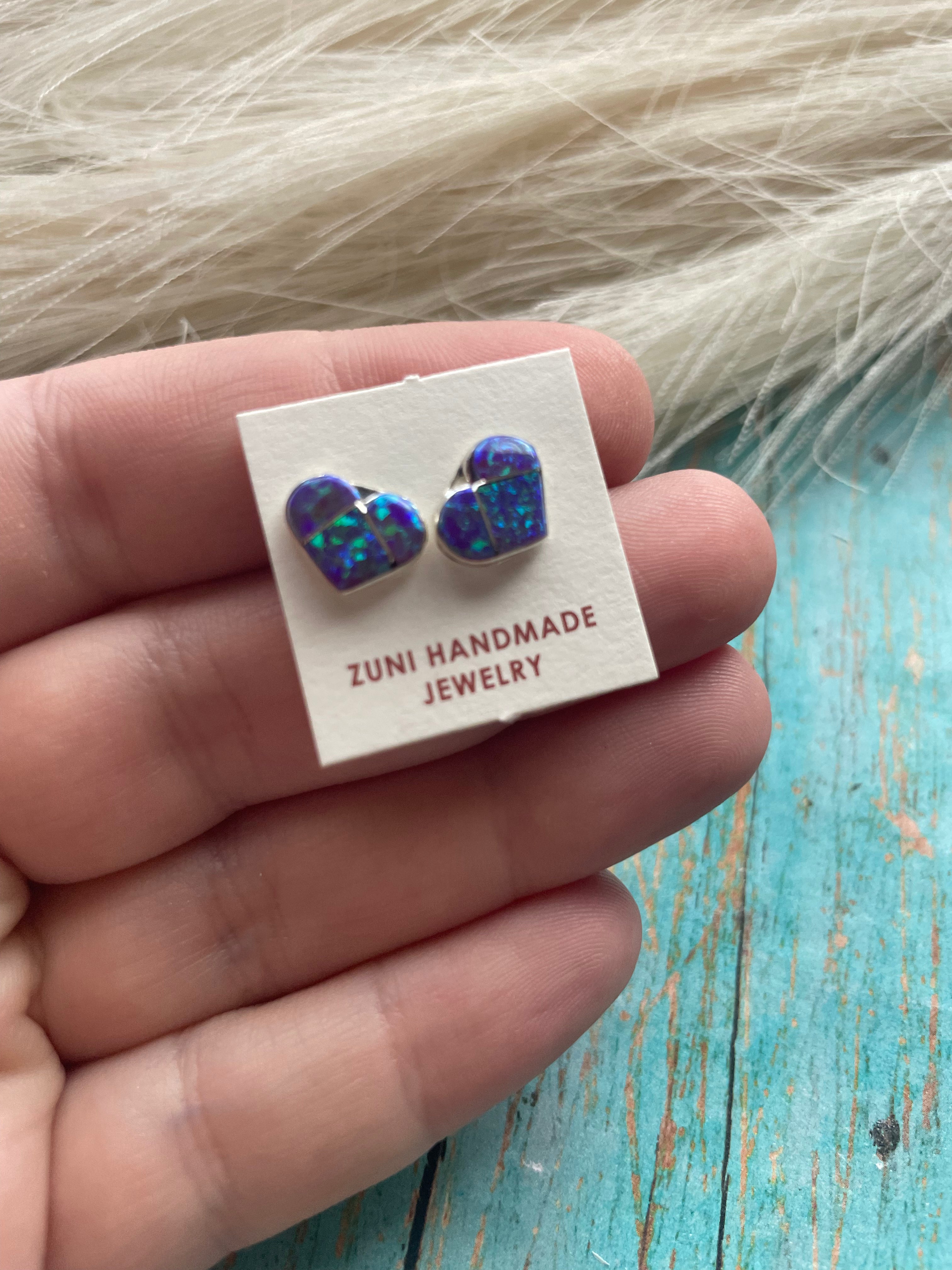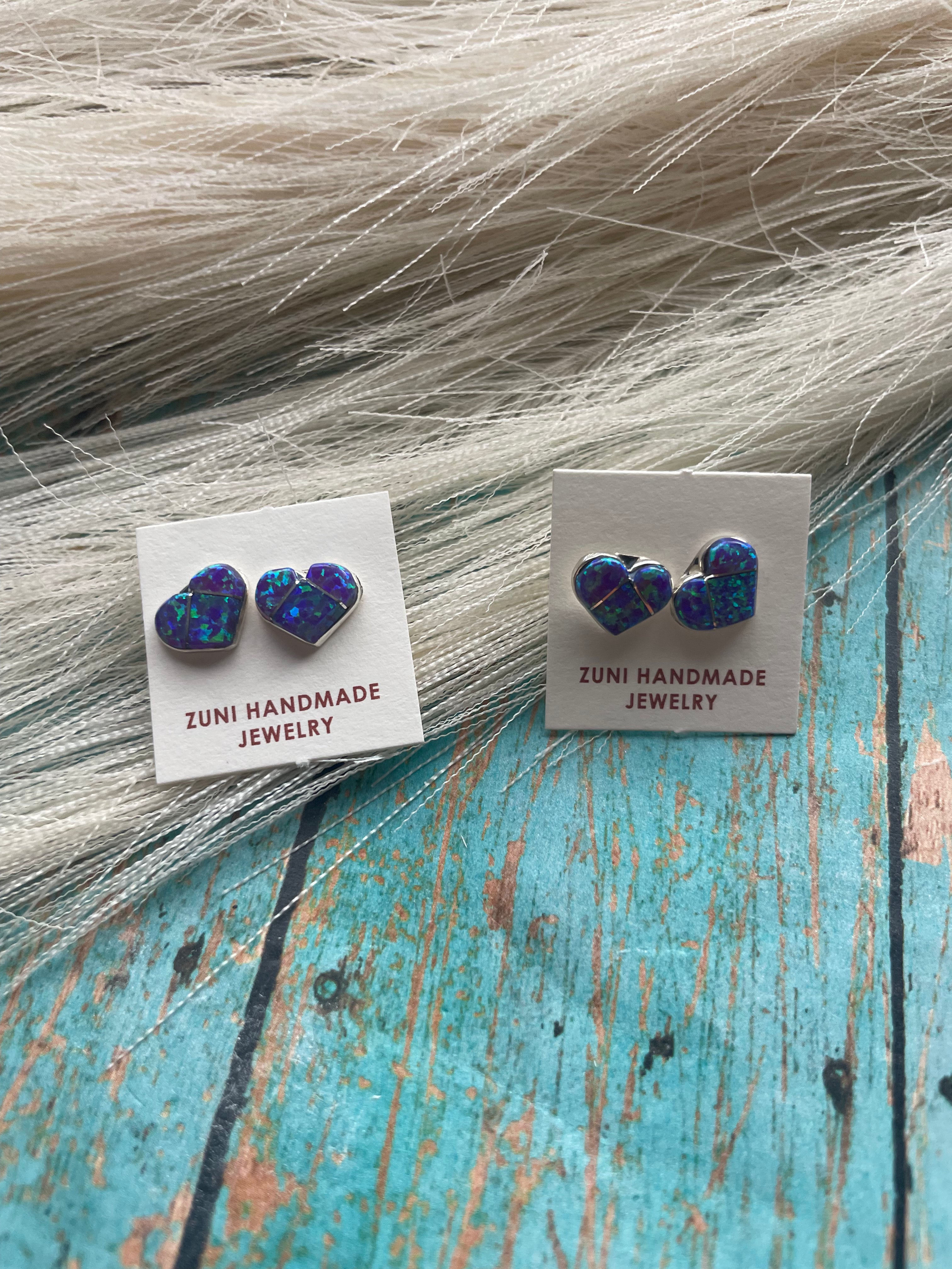 Handcrafted Sterling Silver & Purple Opal Inlay Heart Stud Earrings