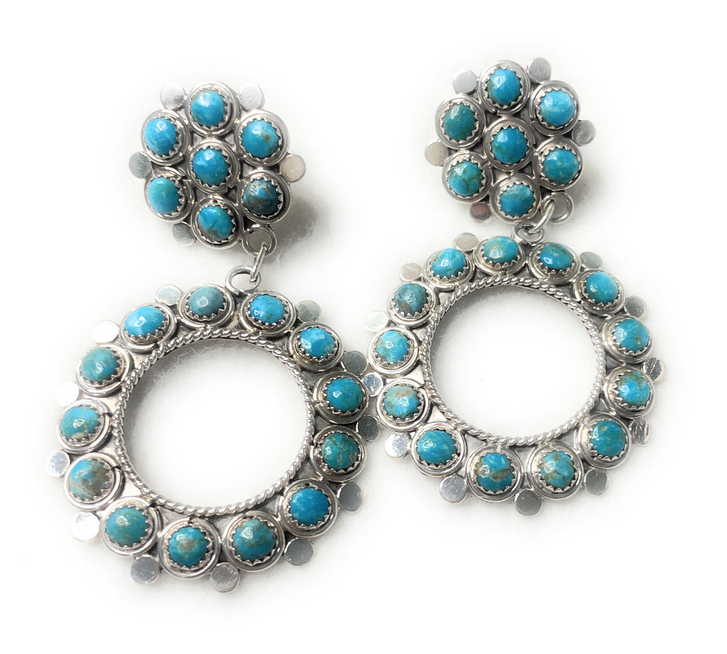 Zuni Turquoise Sterling Silver Dangle Earrings Measuring 3 inches long and 1 3/4 inch wide. Beautiful Bright Turquoise Stones set in Sterling Silver.